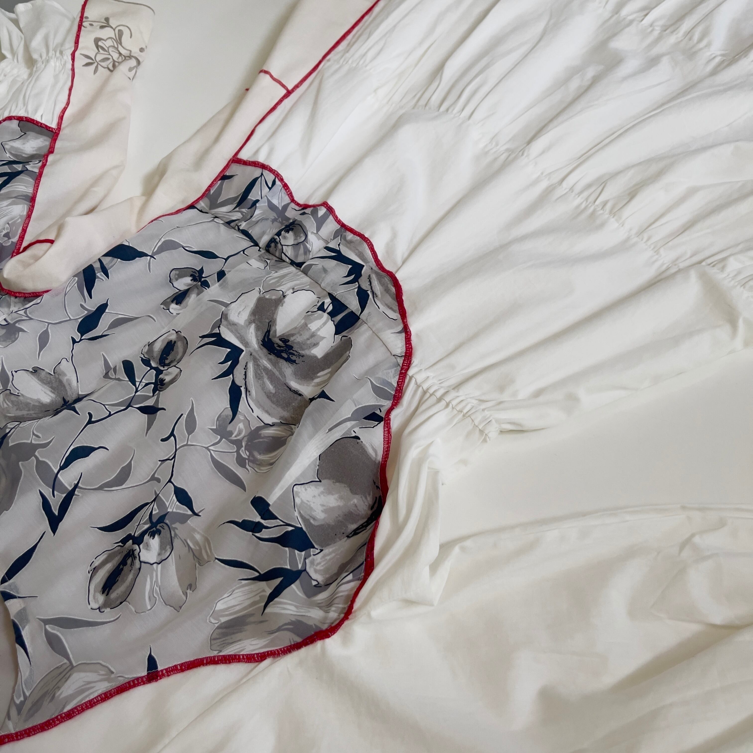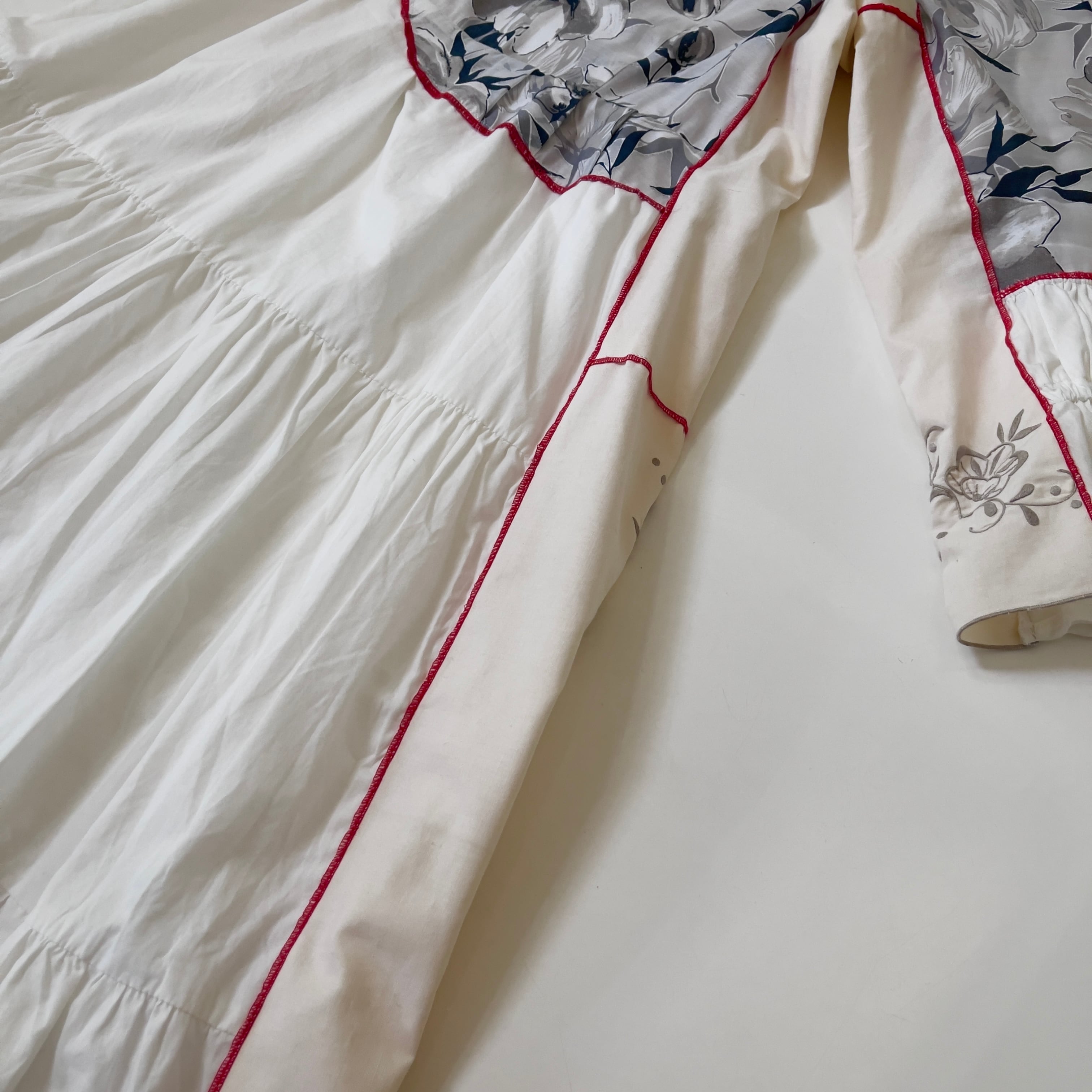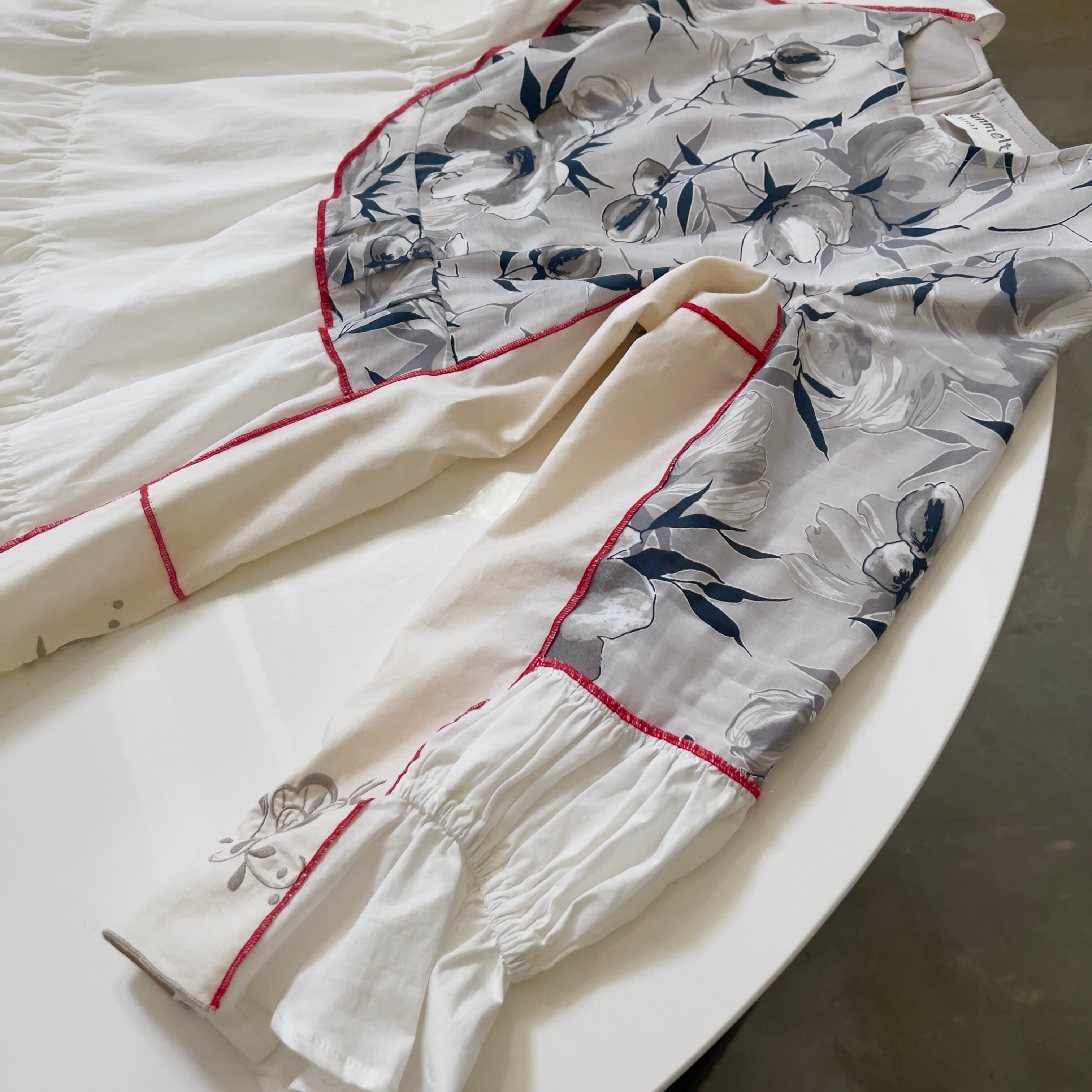 ・飾り縫いにナイロン製の糸を使用しております。中温以上のアイロンをあてると溶ける可能性がございます。アイロンの際はあて布を使用して下さい。