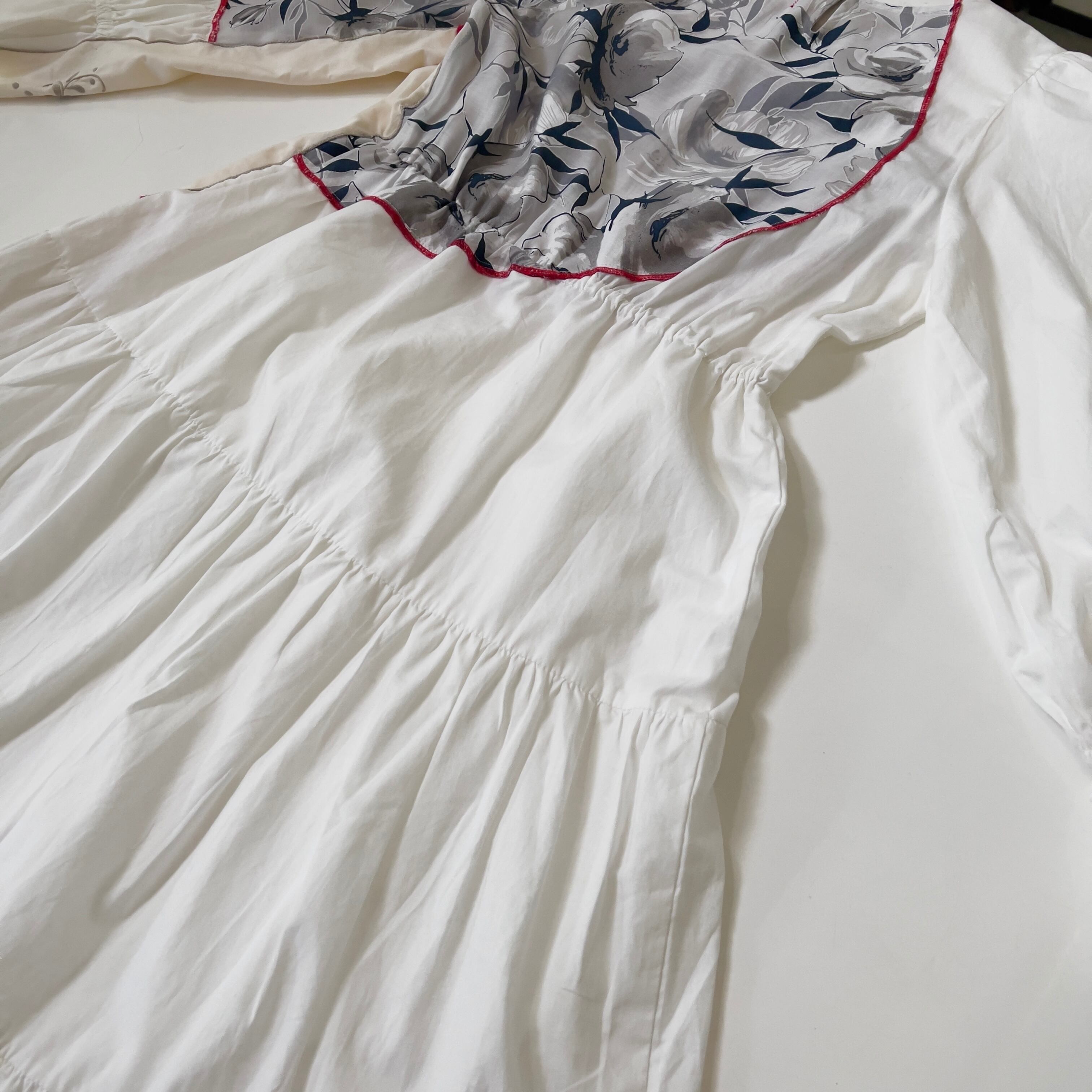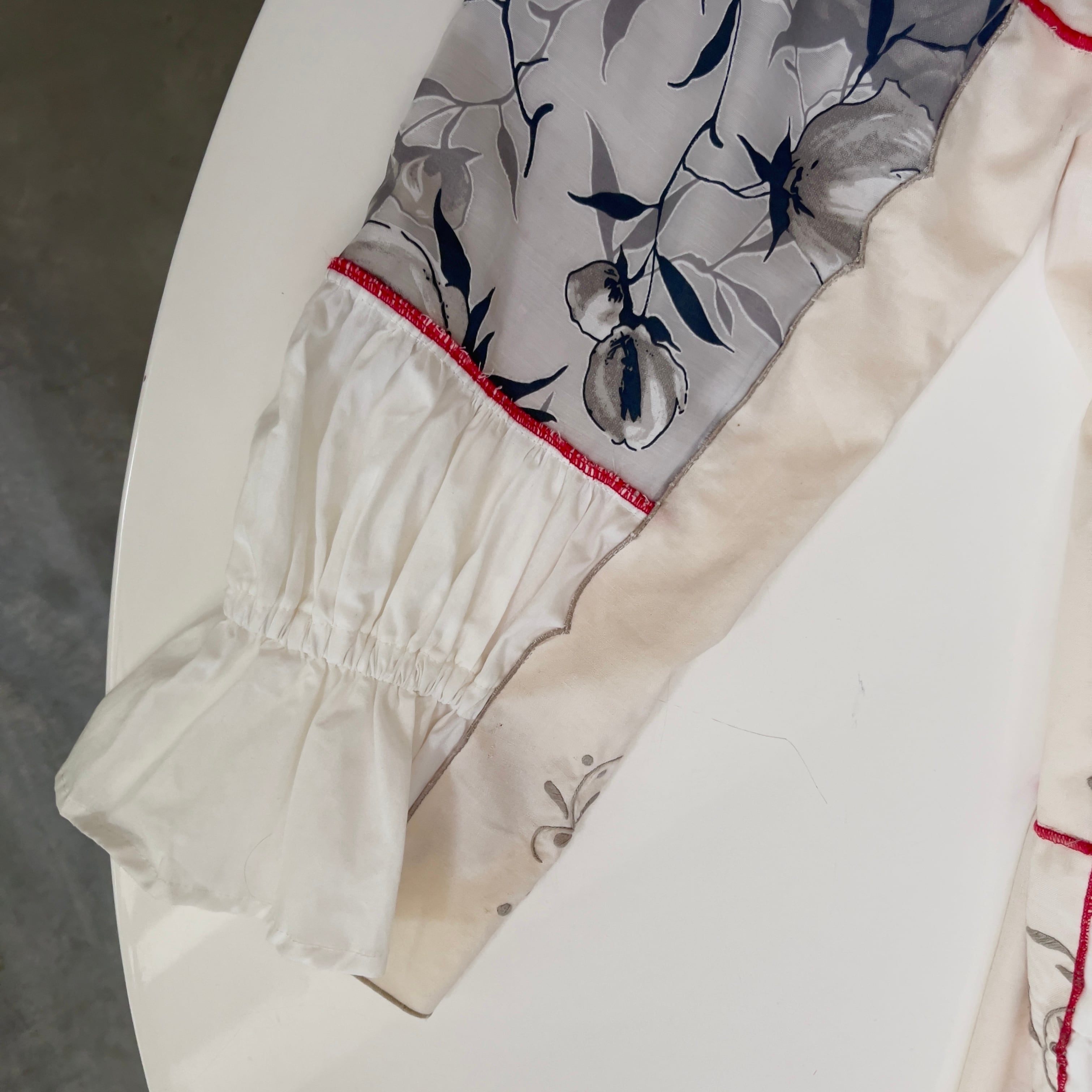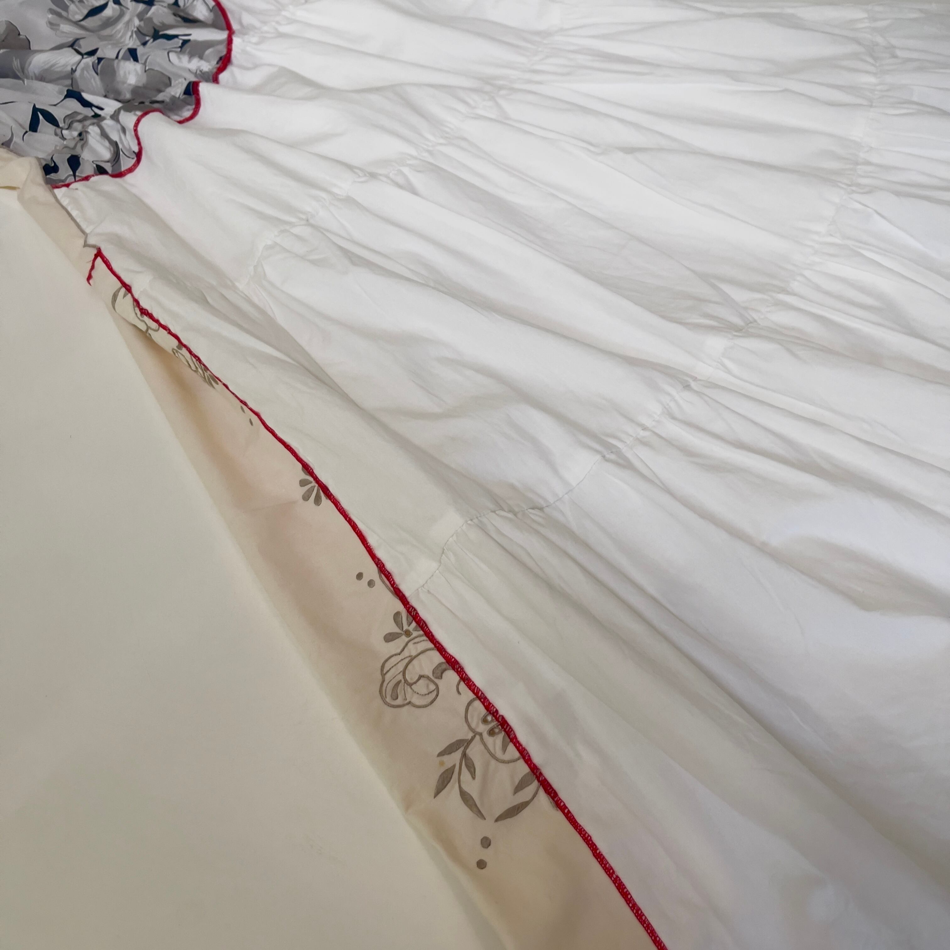 ・飾り縫いにナイロン製の糸を使用しております。中温以上のアイロンをあてると溶ける可能性がございます。アイロンの際はあて布を使用して下さい。