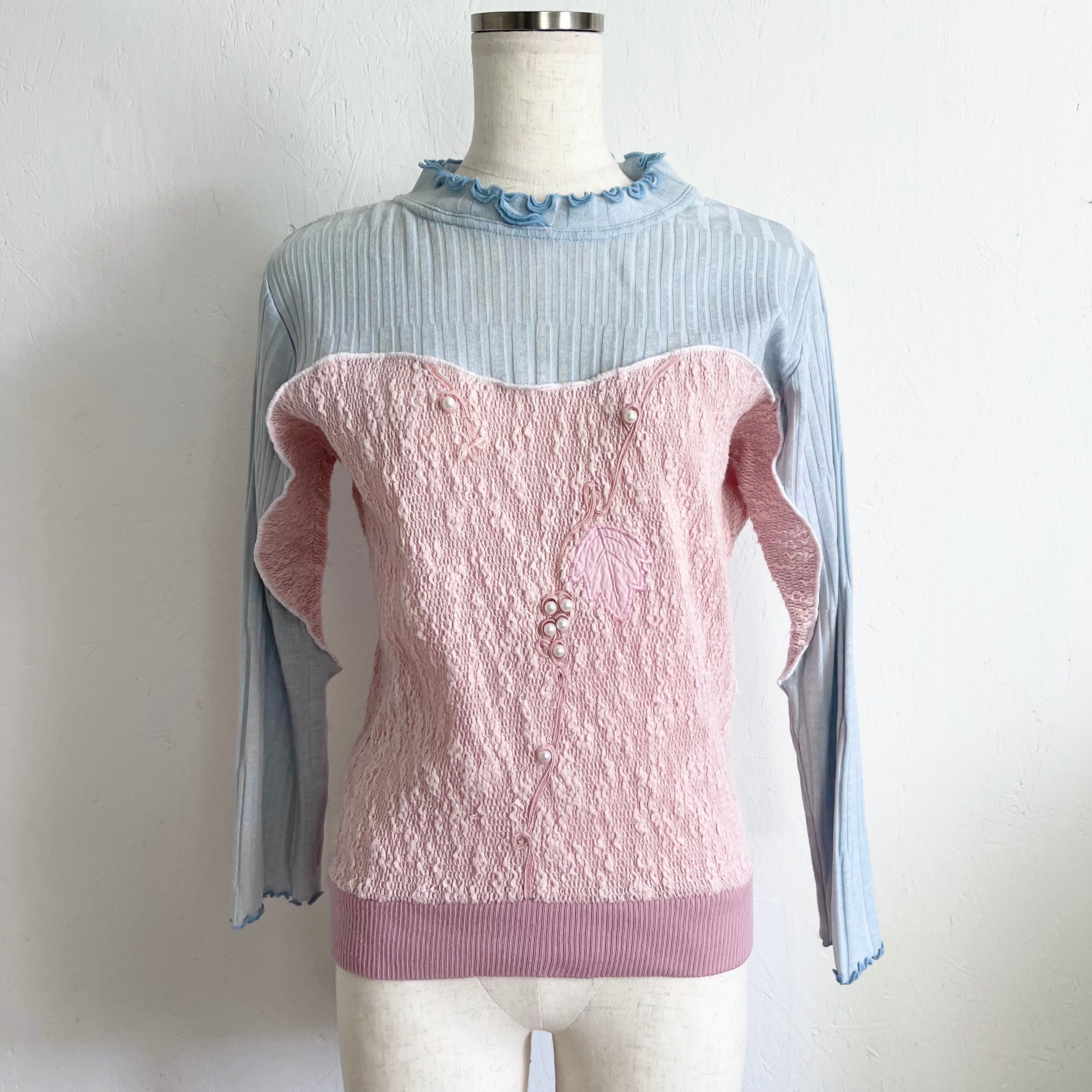 淡い水色の薄手リブニットカットソーとレトロなパールの刺繍がかわいいピンクのカットソーをシャッフルしました。