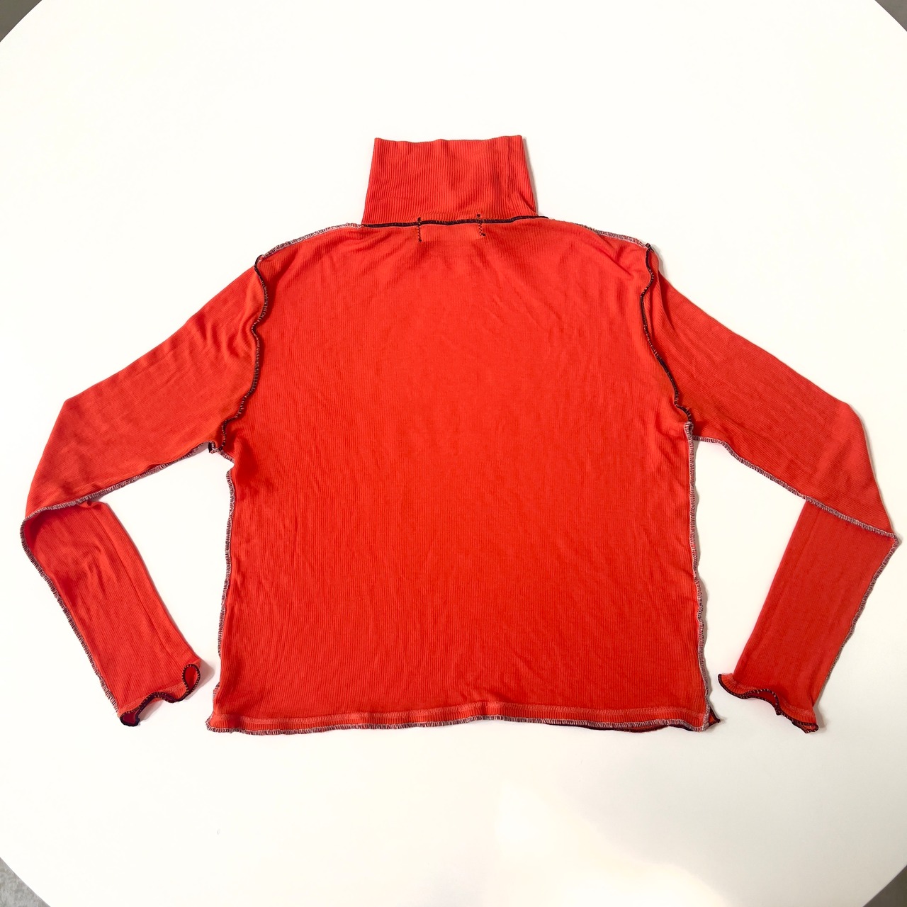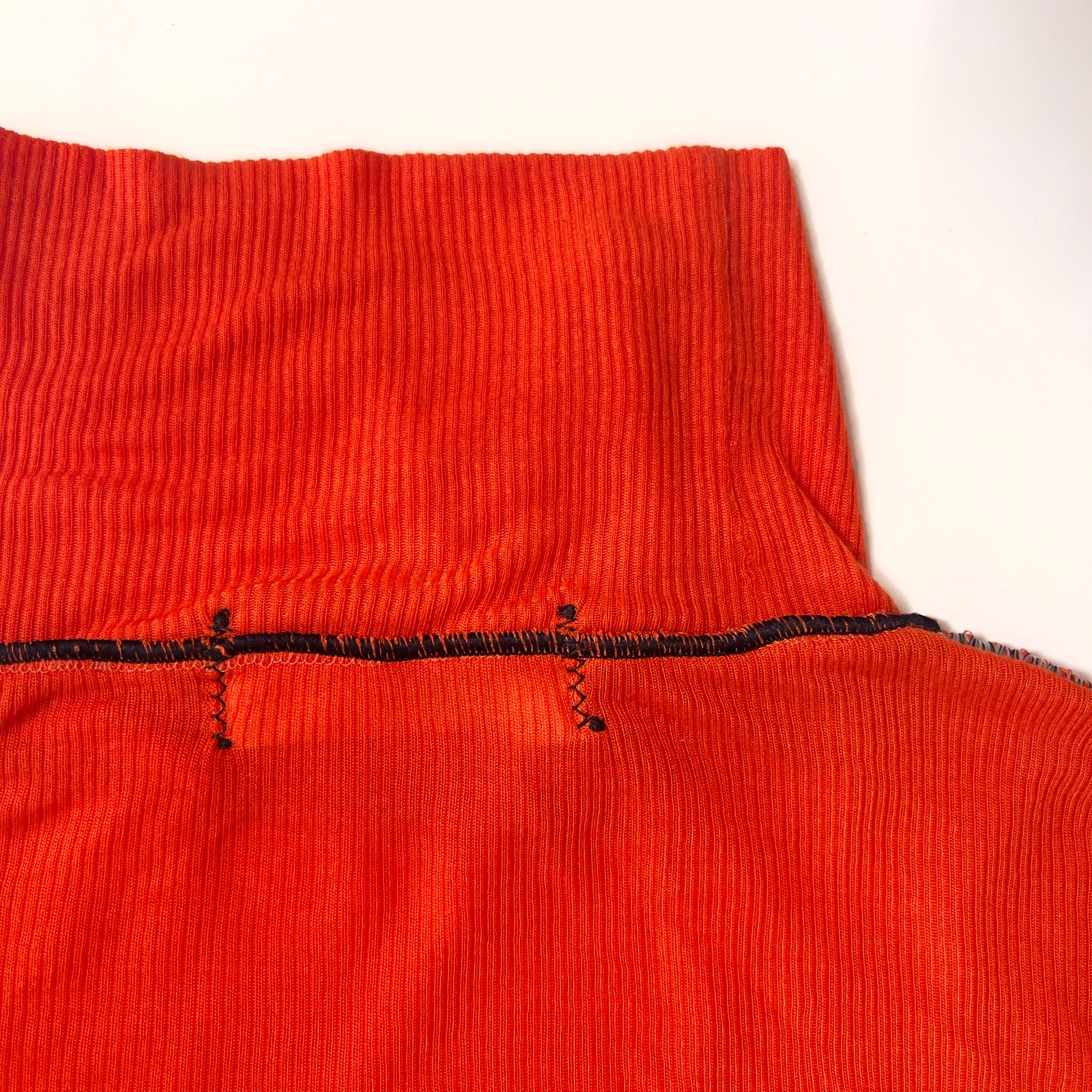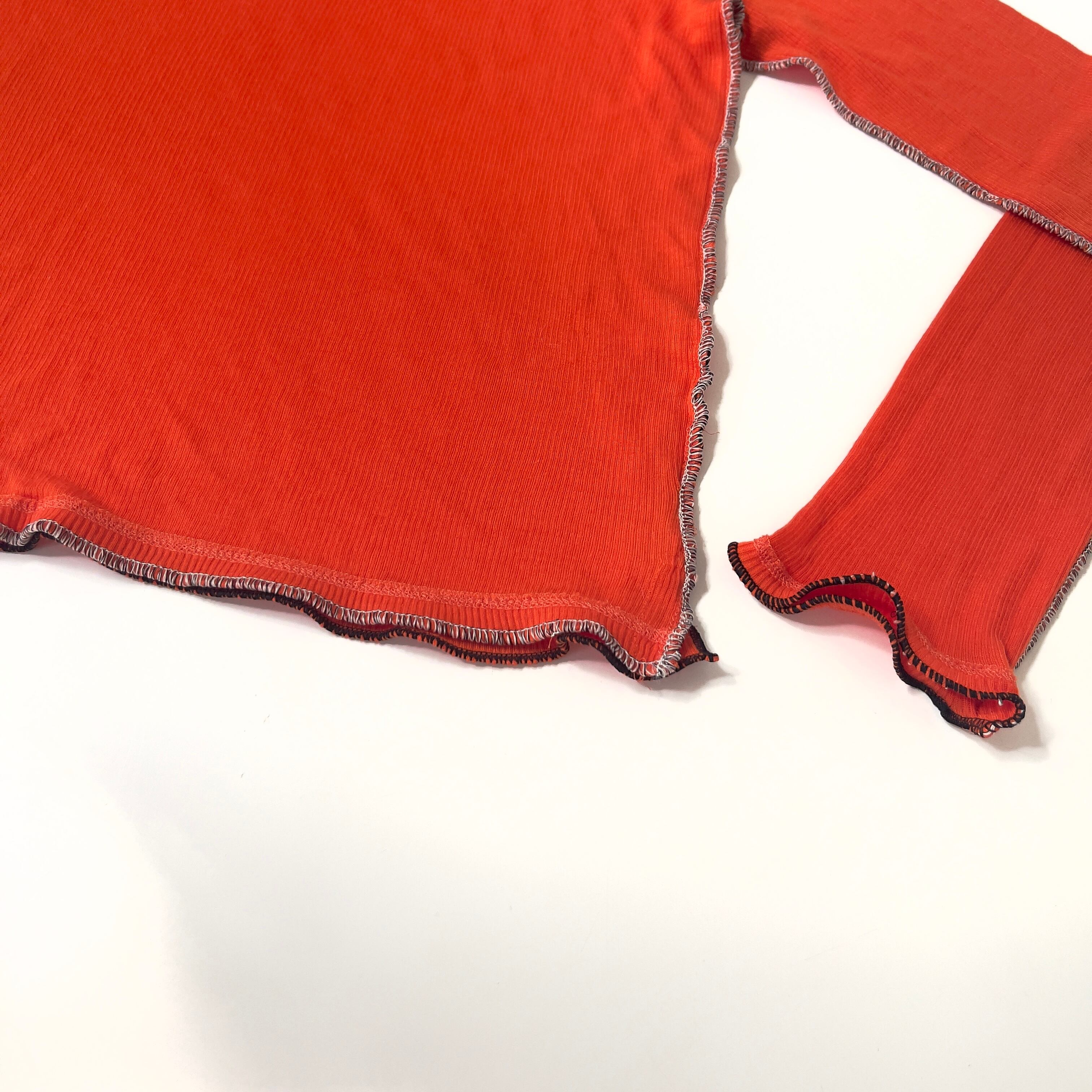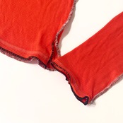 ニットの切替線=縫い目を服の骨組みと捉え、太いロックミシンのステッチで服の骨組を強化したイメージです。