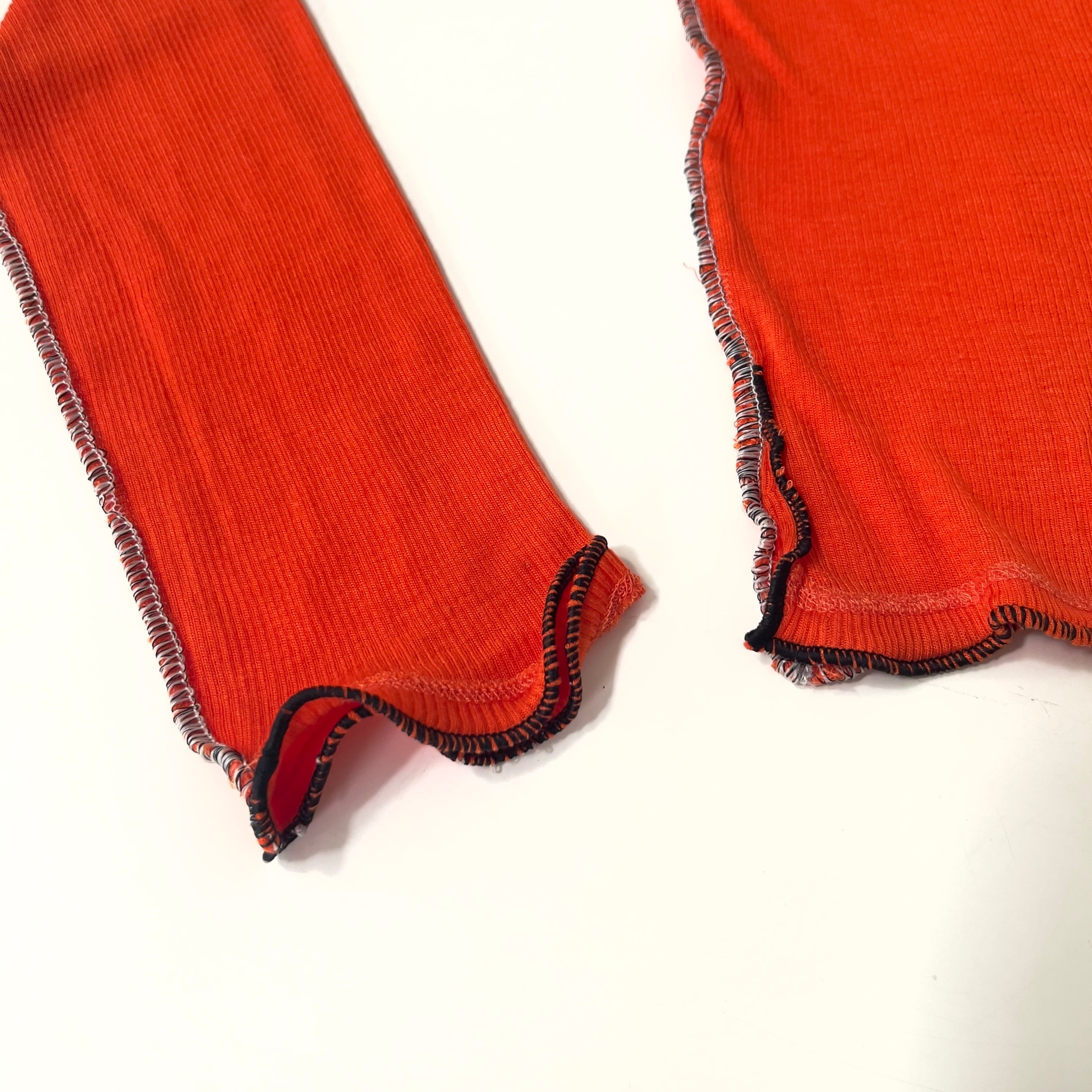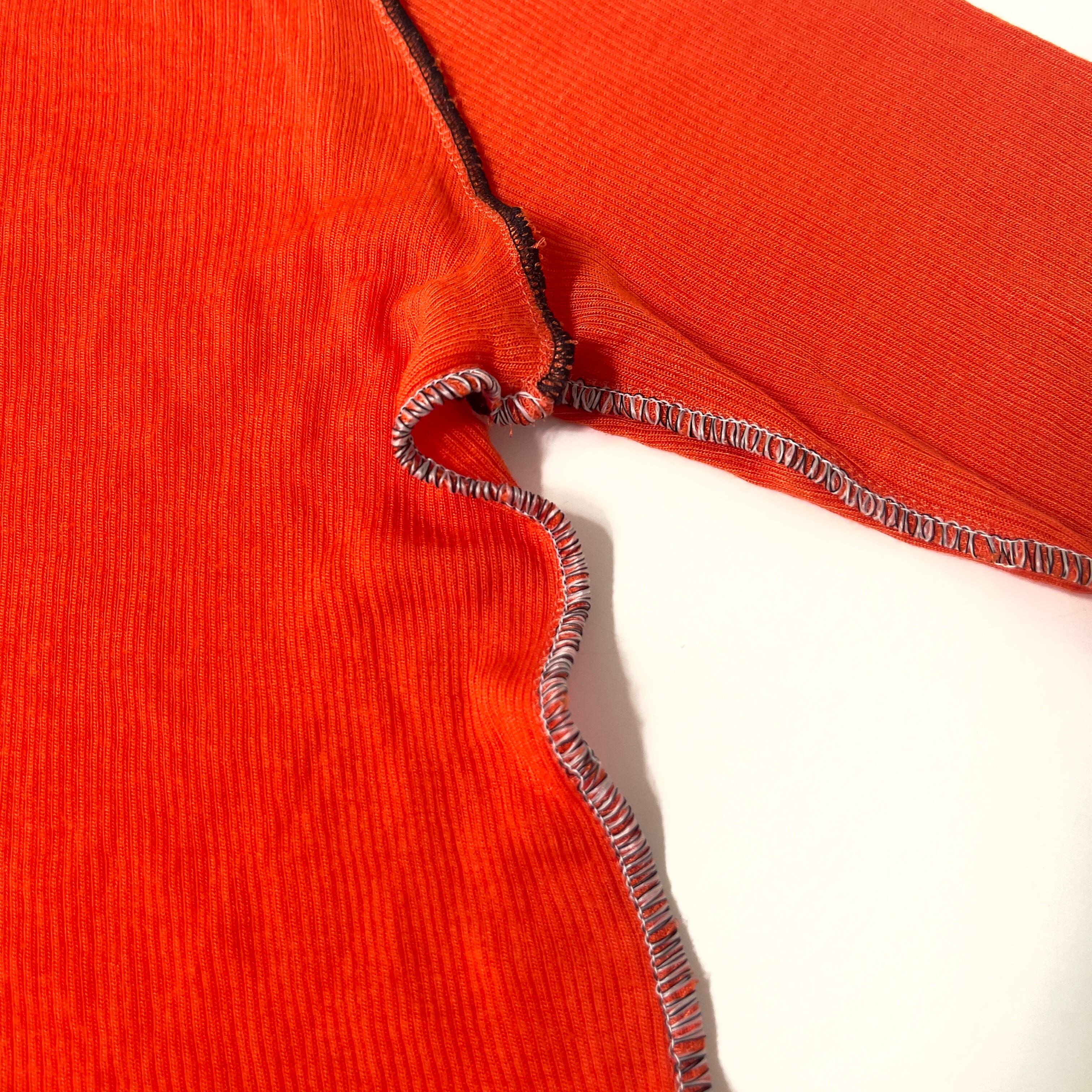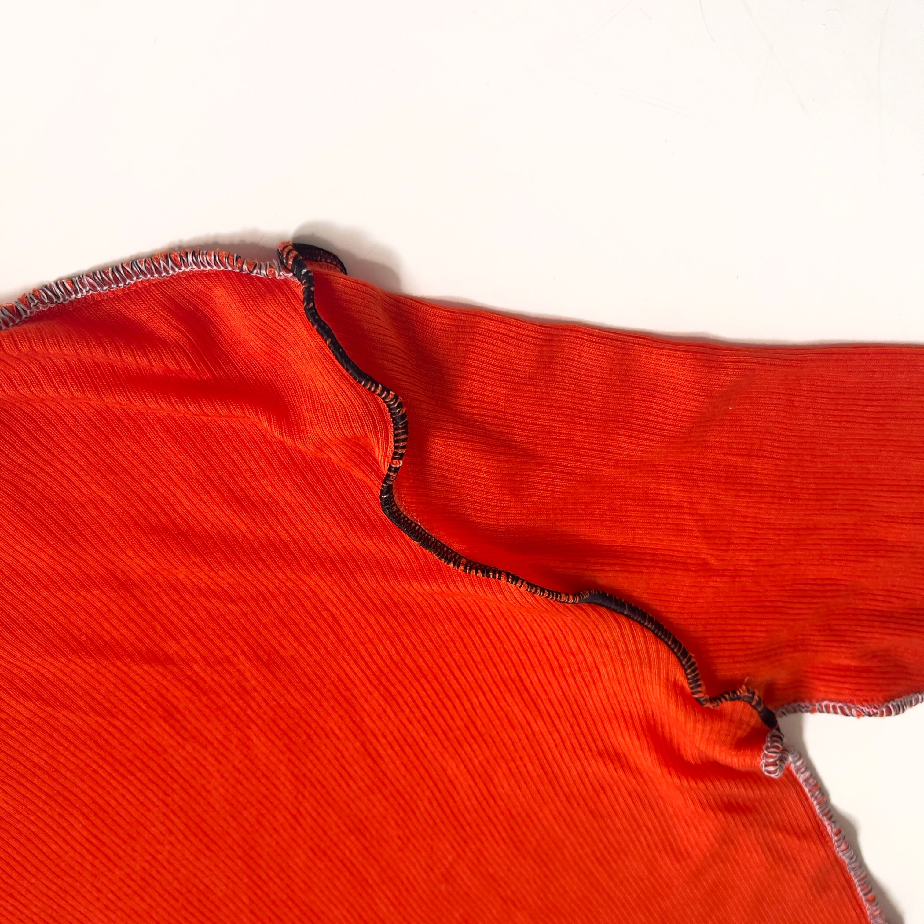ニットの切替線=縫い目を服の骨組みと捉え、太いロックミシンのステッチで服の骨組を強化したイメージです。