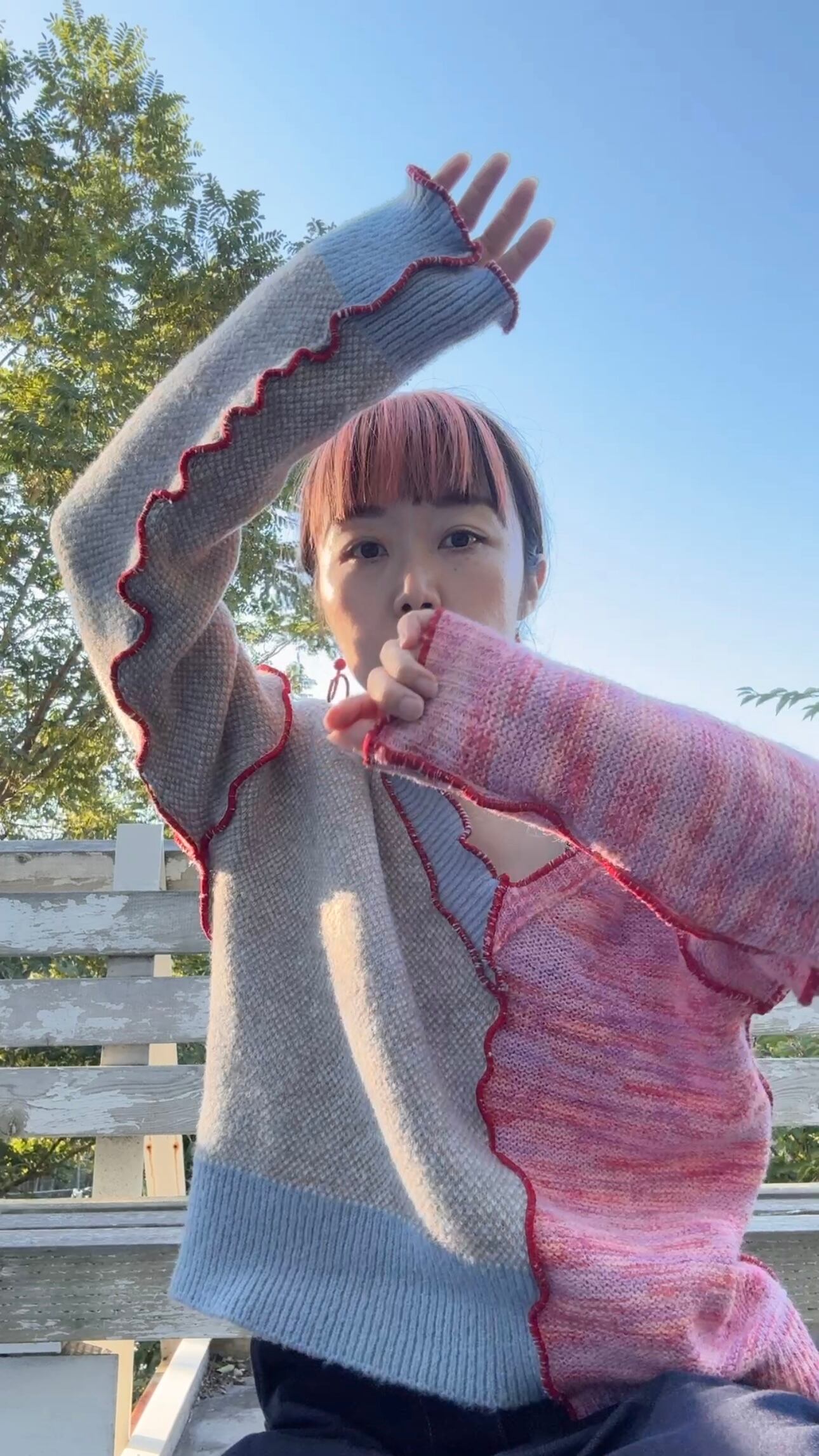 水色×ピンクのポップなVネックニットをドッキングして、贅沢にあらゆる箇所に赤ステッチをほどこしたスペシャルなニット。