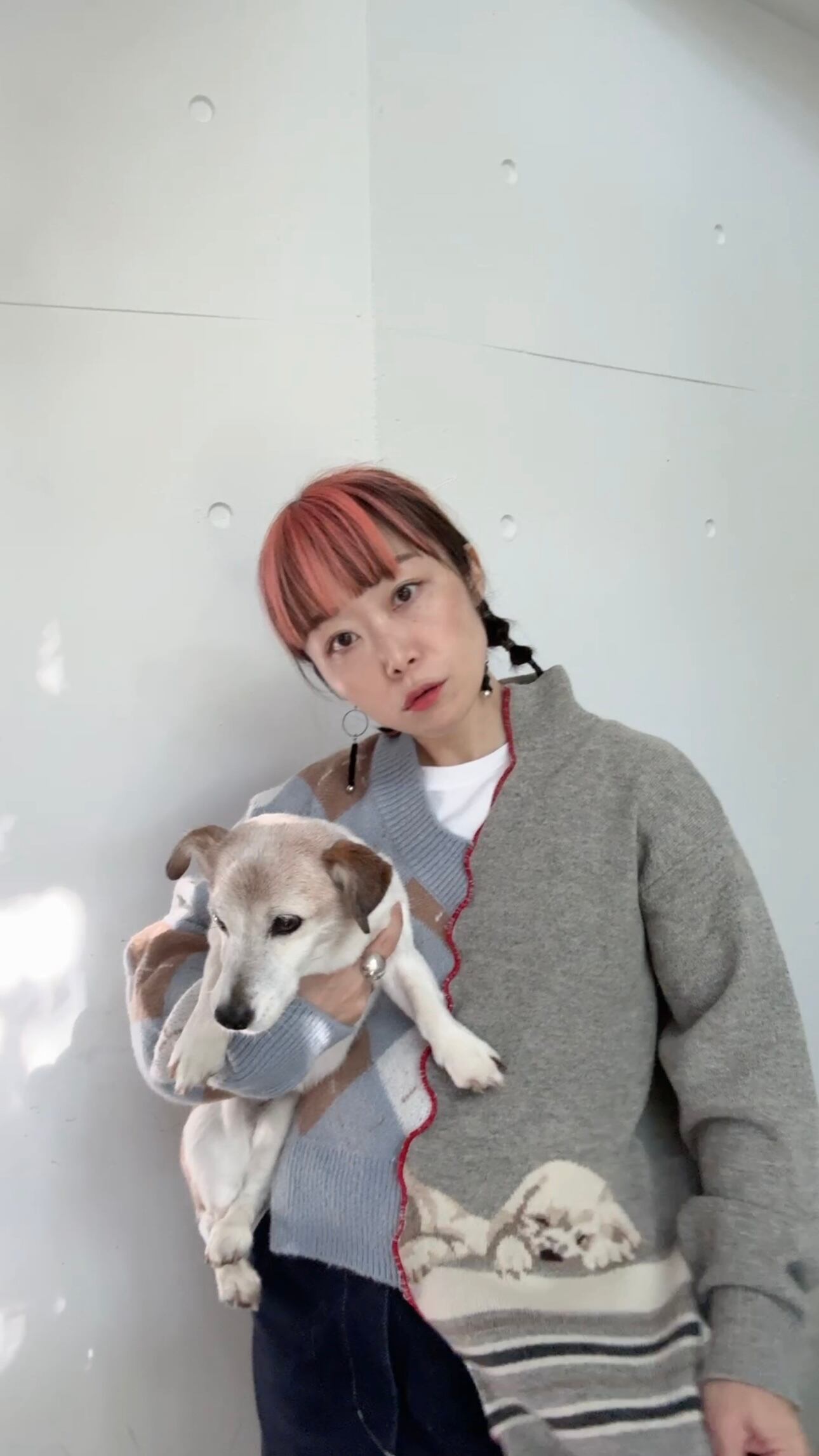 子供の頃にお母さんが着てたような犬が付いたウール100%のグレーハイネックニットと、落ち着いたアイスブルーのアーガイル柄Vネックショート丈ニットの組合せ。
