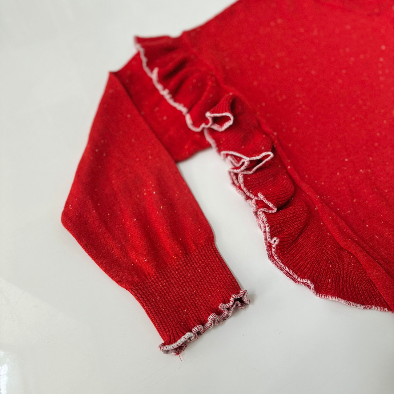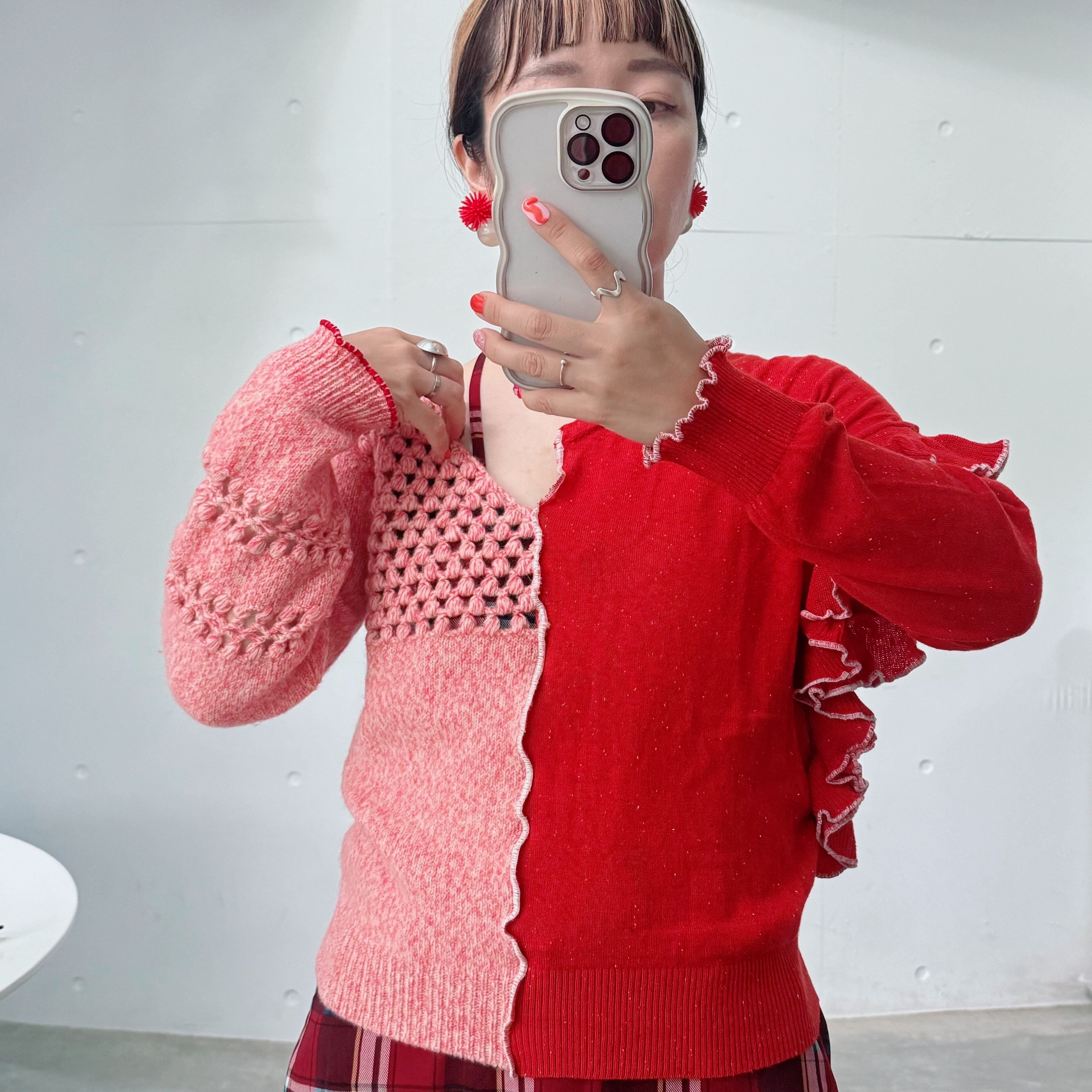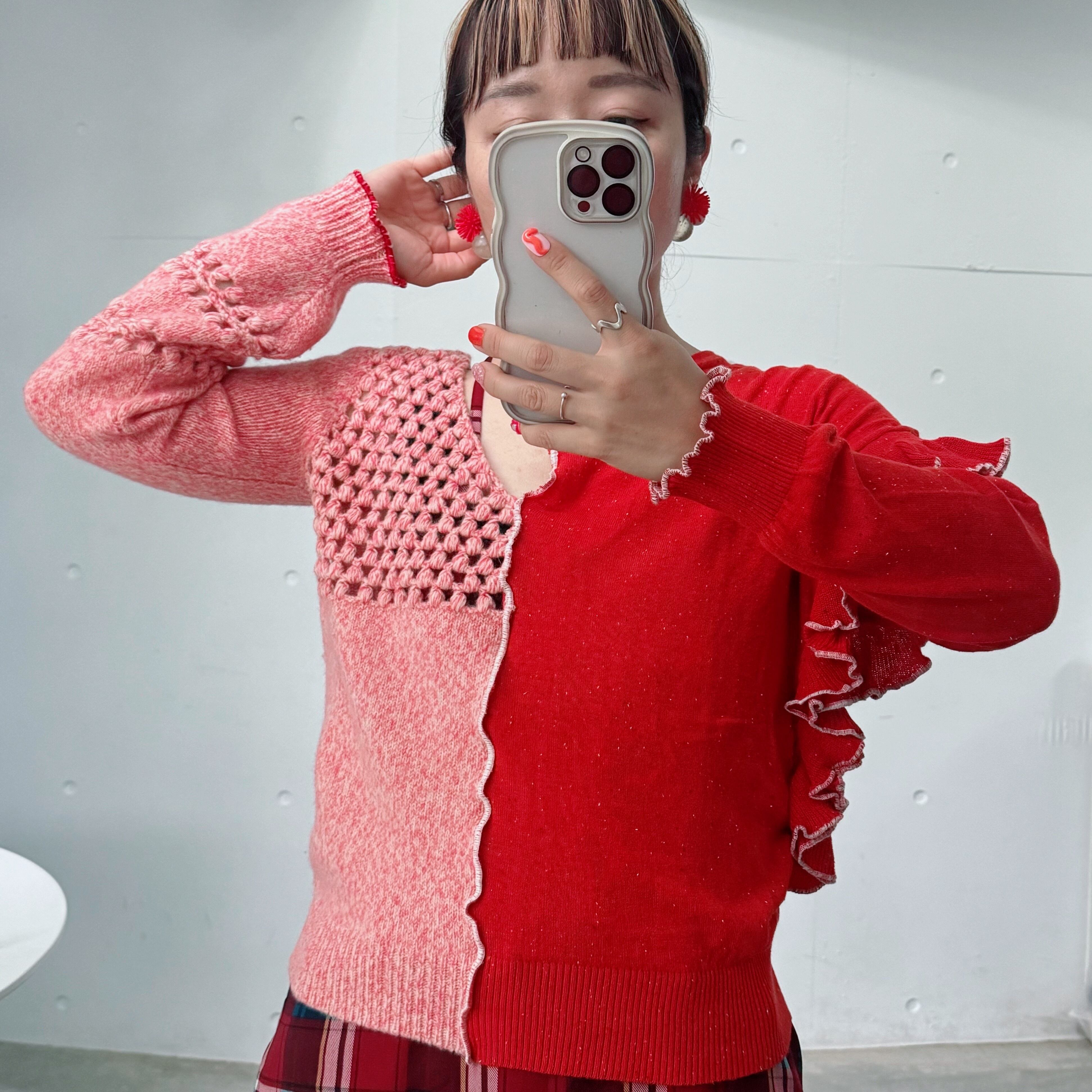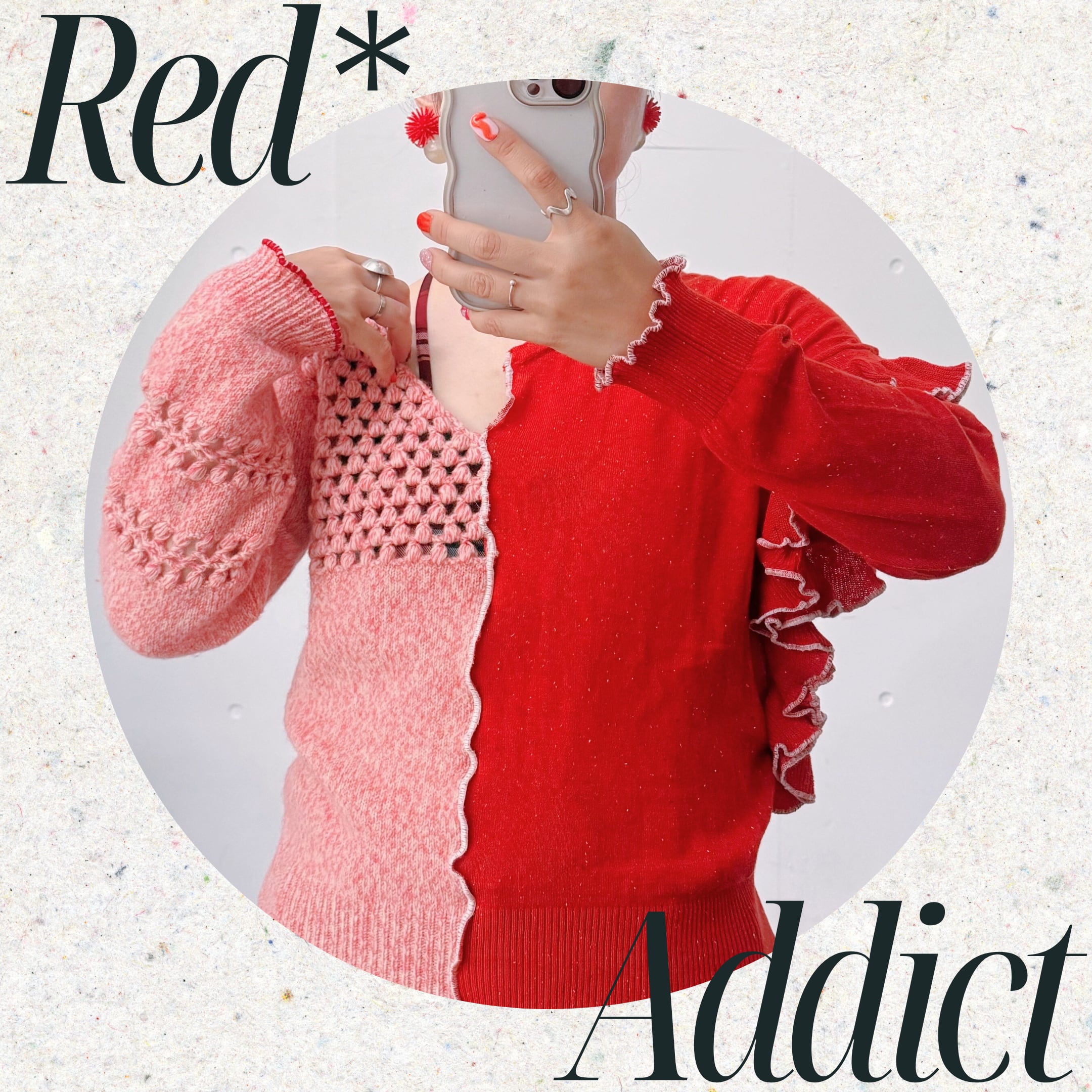 フリルと模様編み、赤い生地にもポツポツ散りばめられた模様がかわいいし、様々なディテールを楽しめる1枚♥️