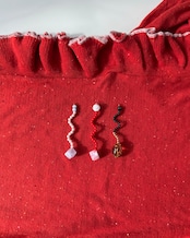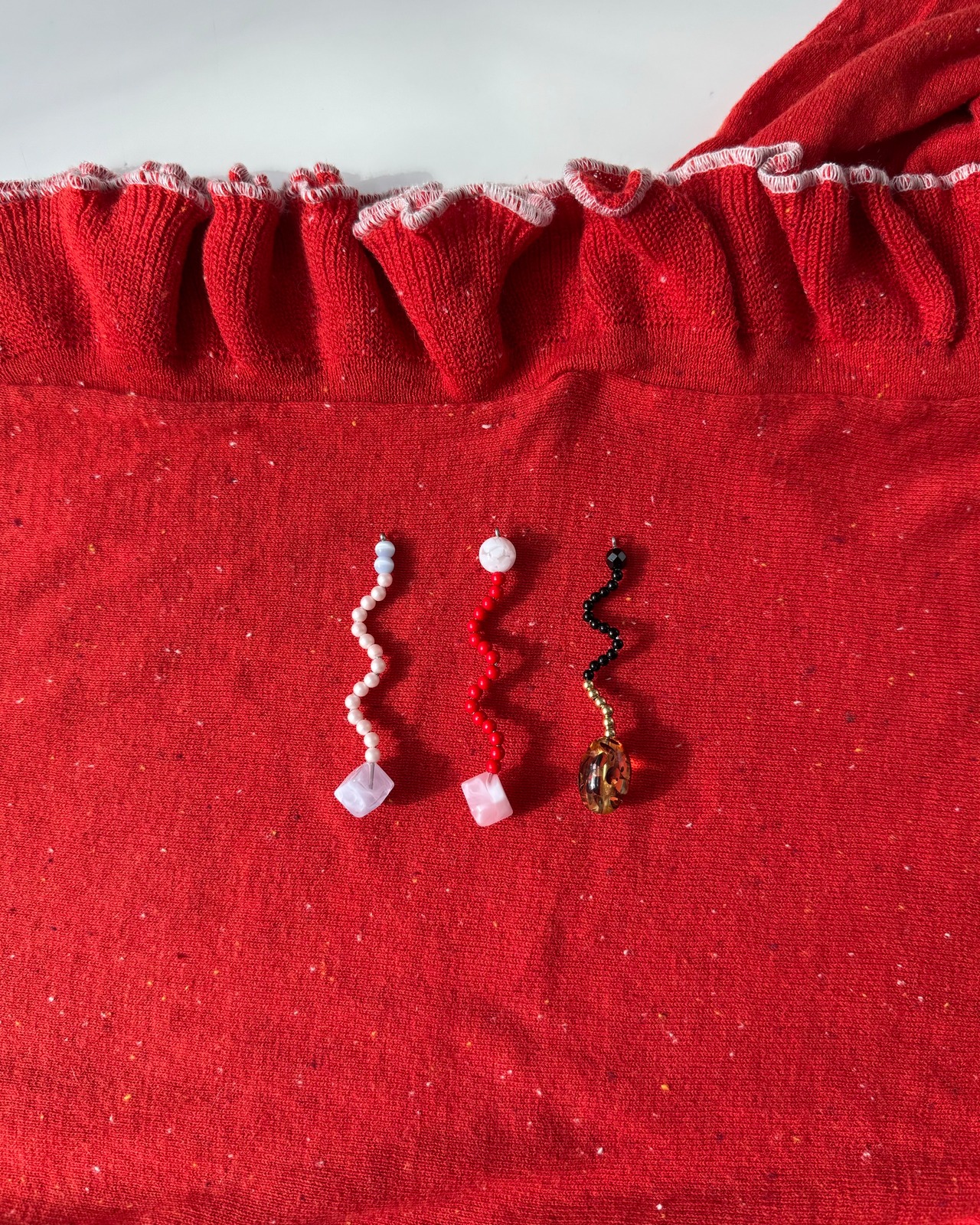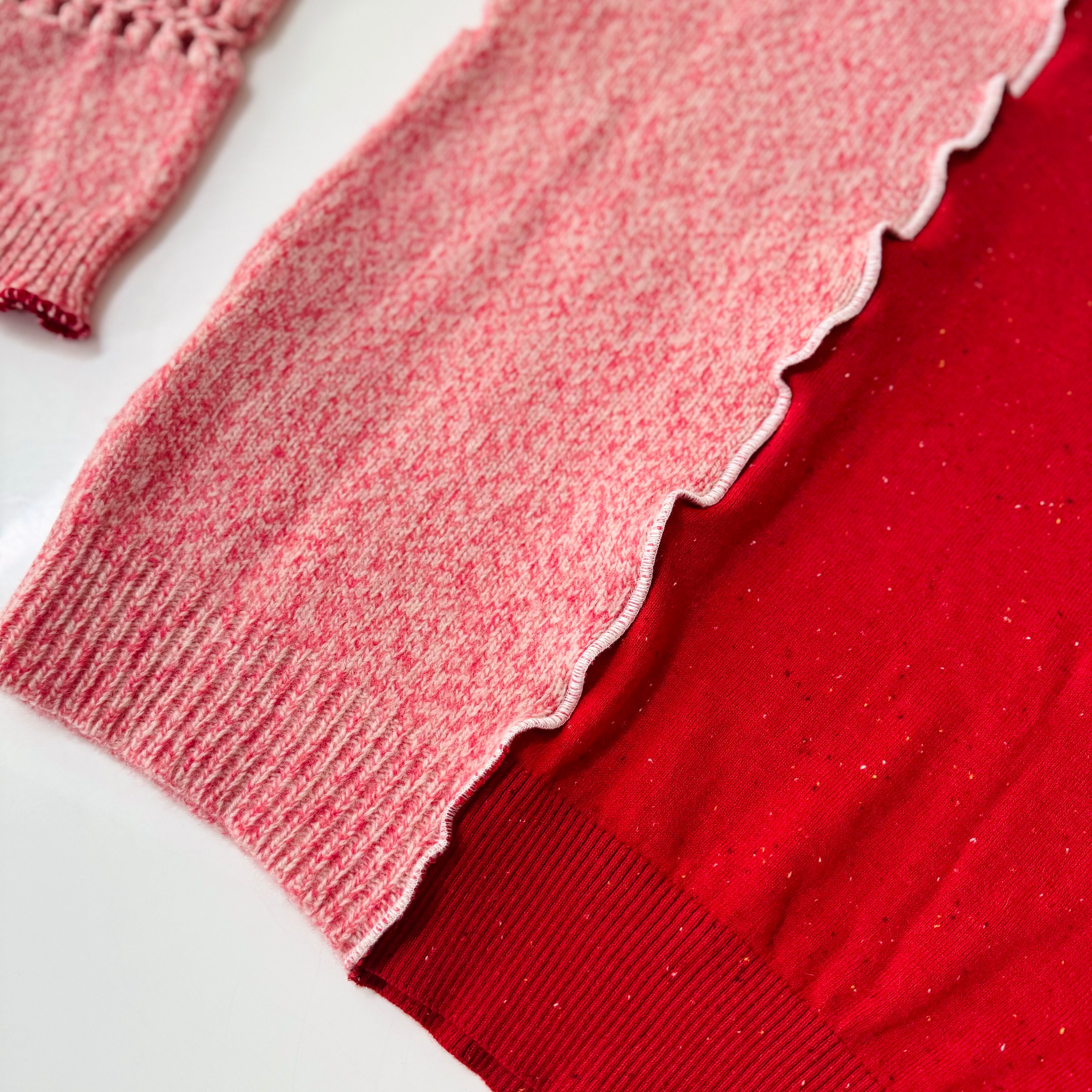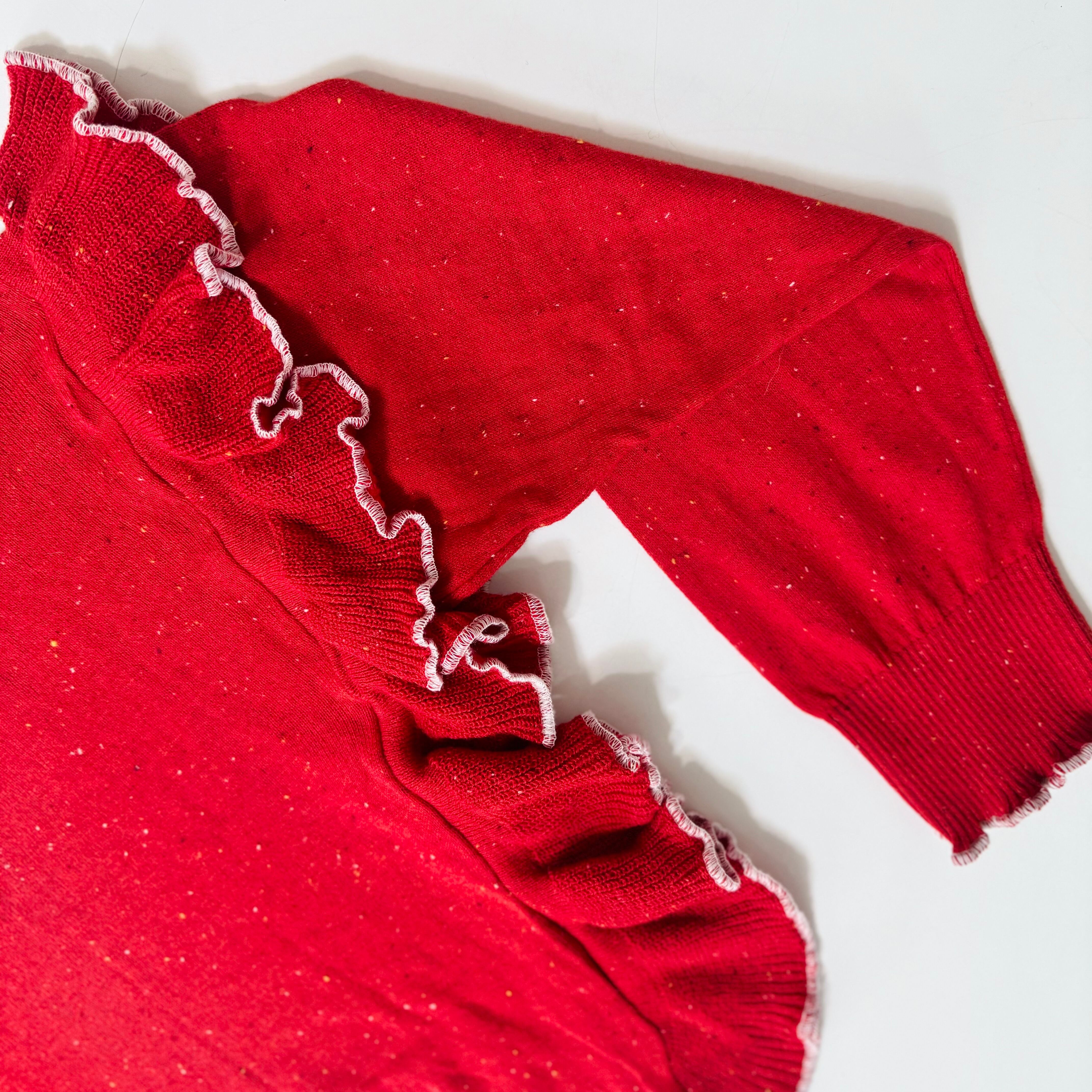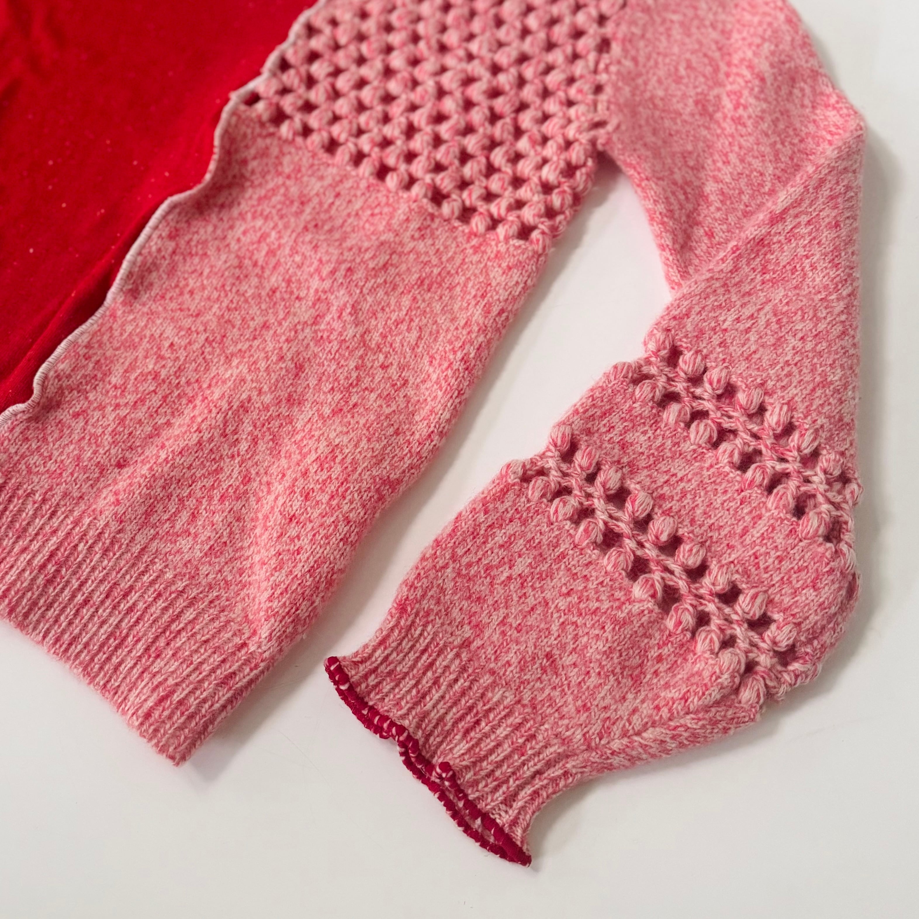 フリルと模様編み、赤い生地にもポツポツ散りばめられた模様がかわいいし、様々なディテールを楽しめる1枚♥️