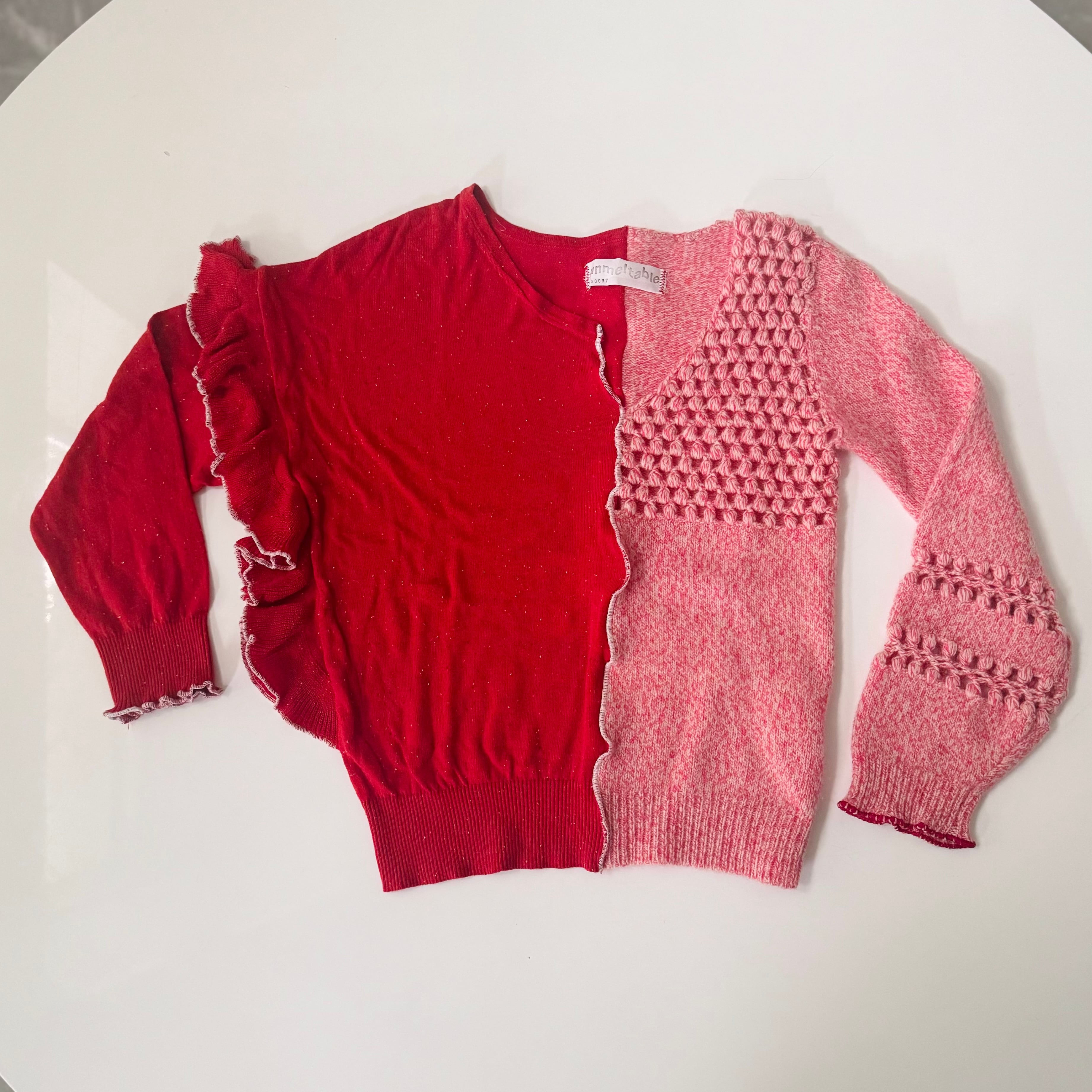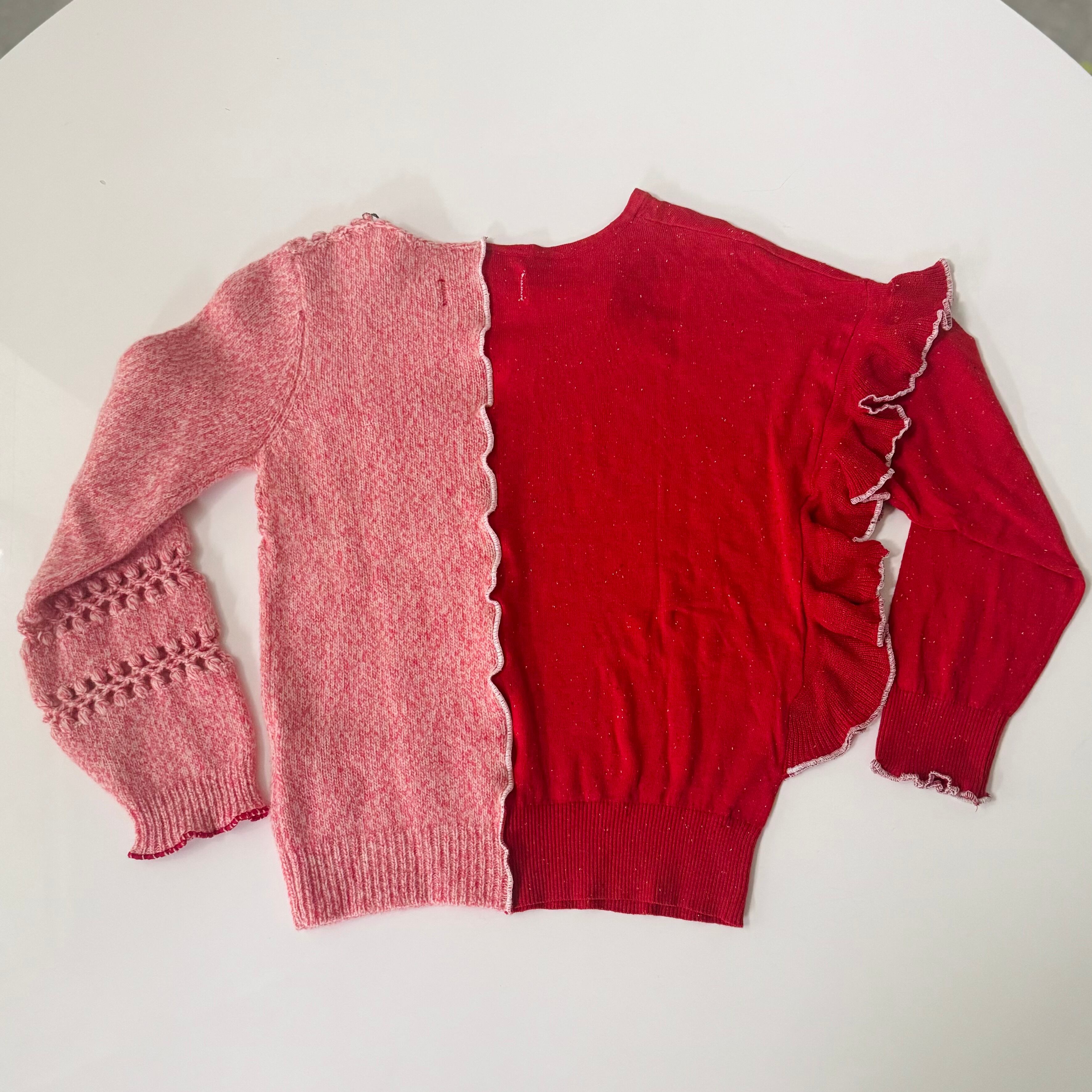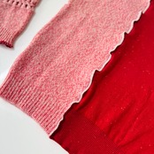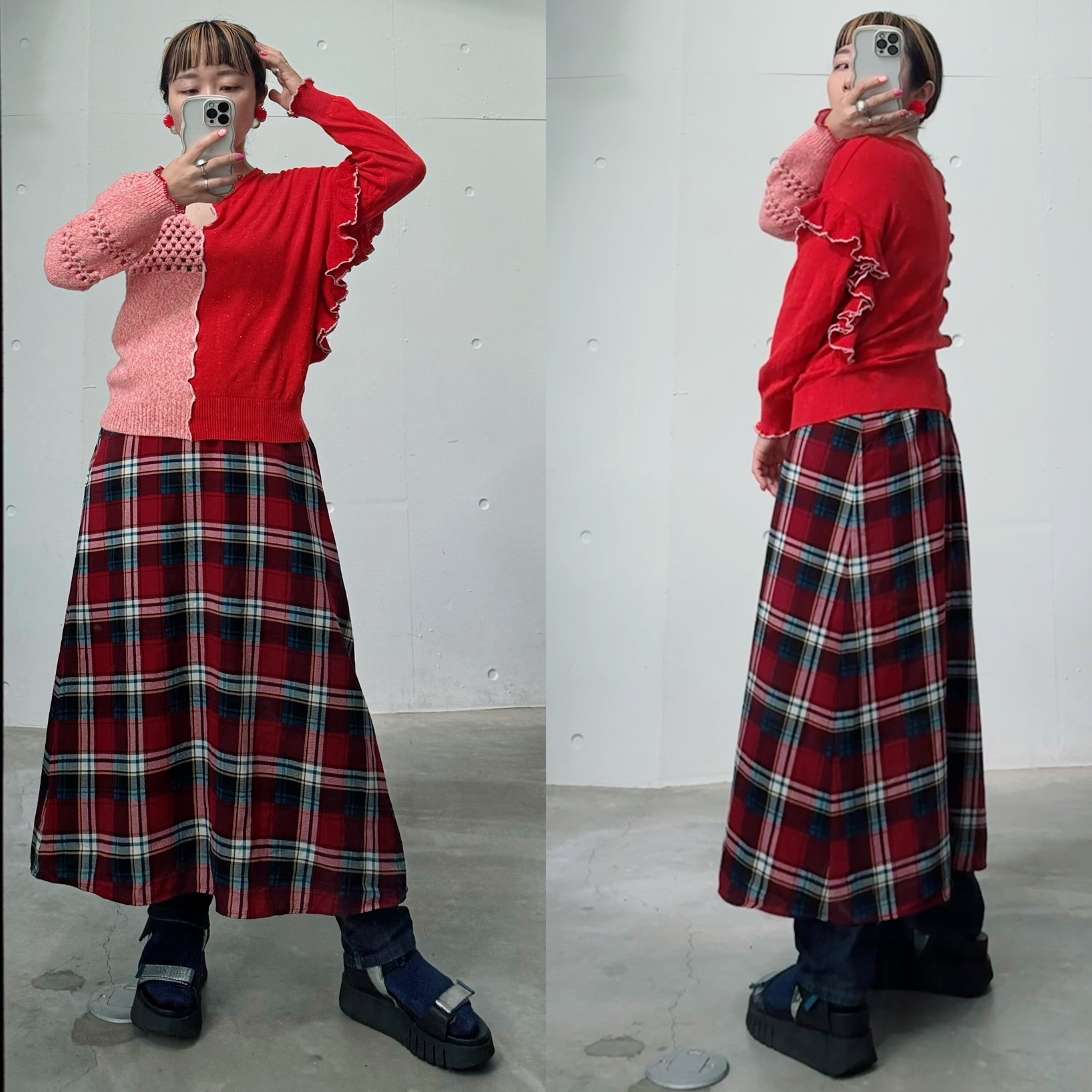 フリル付きの赤は綿100%、模様編み入りの赤白ミックス・ヴィンテージニットはウール100%なので、若干、左半身が暑く感じるニットです笑