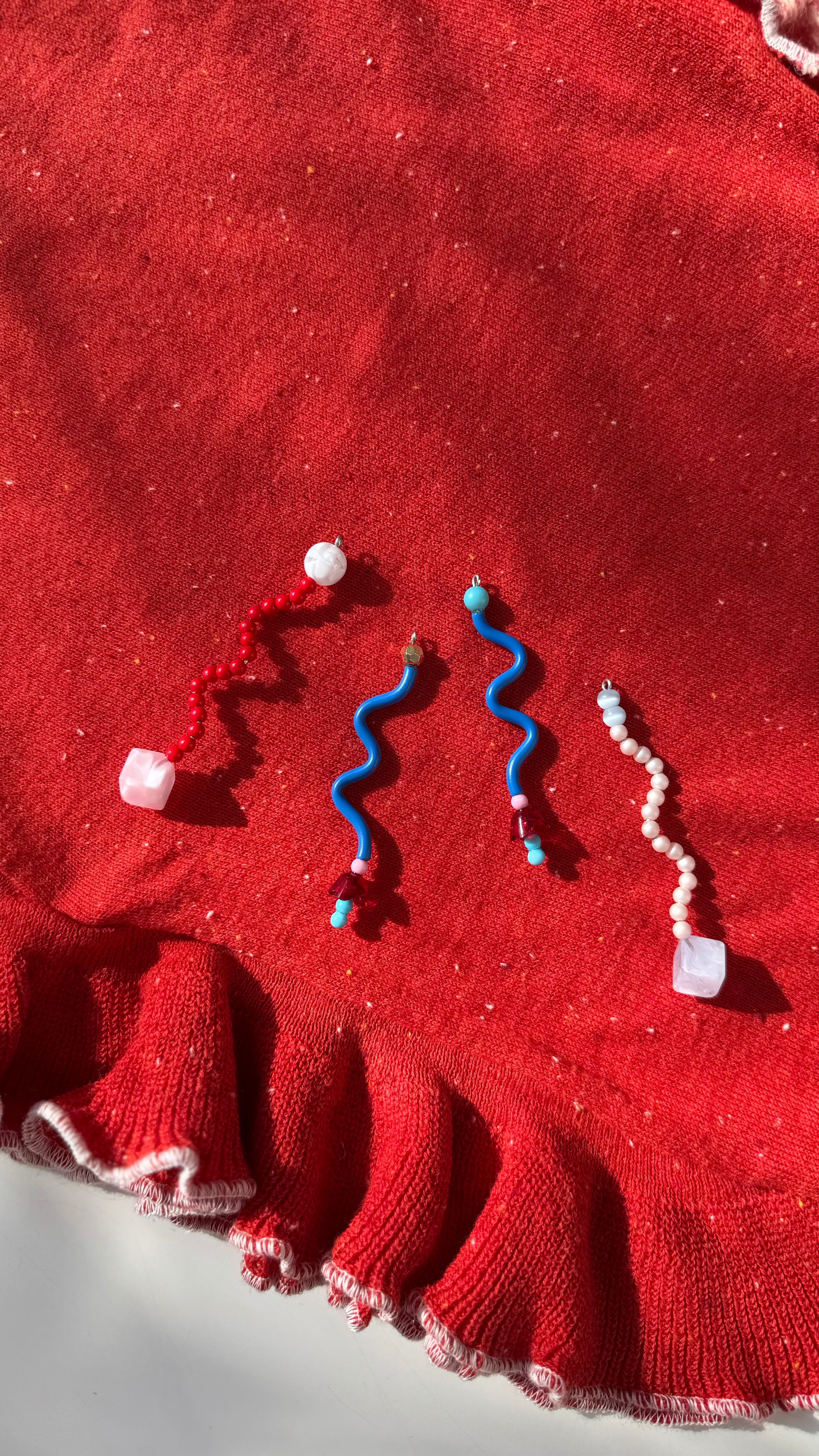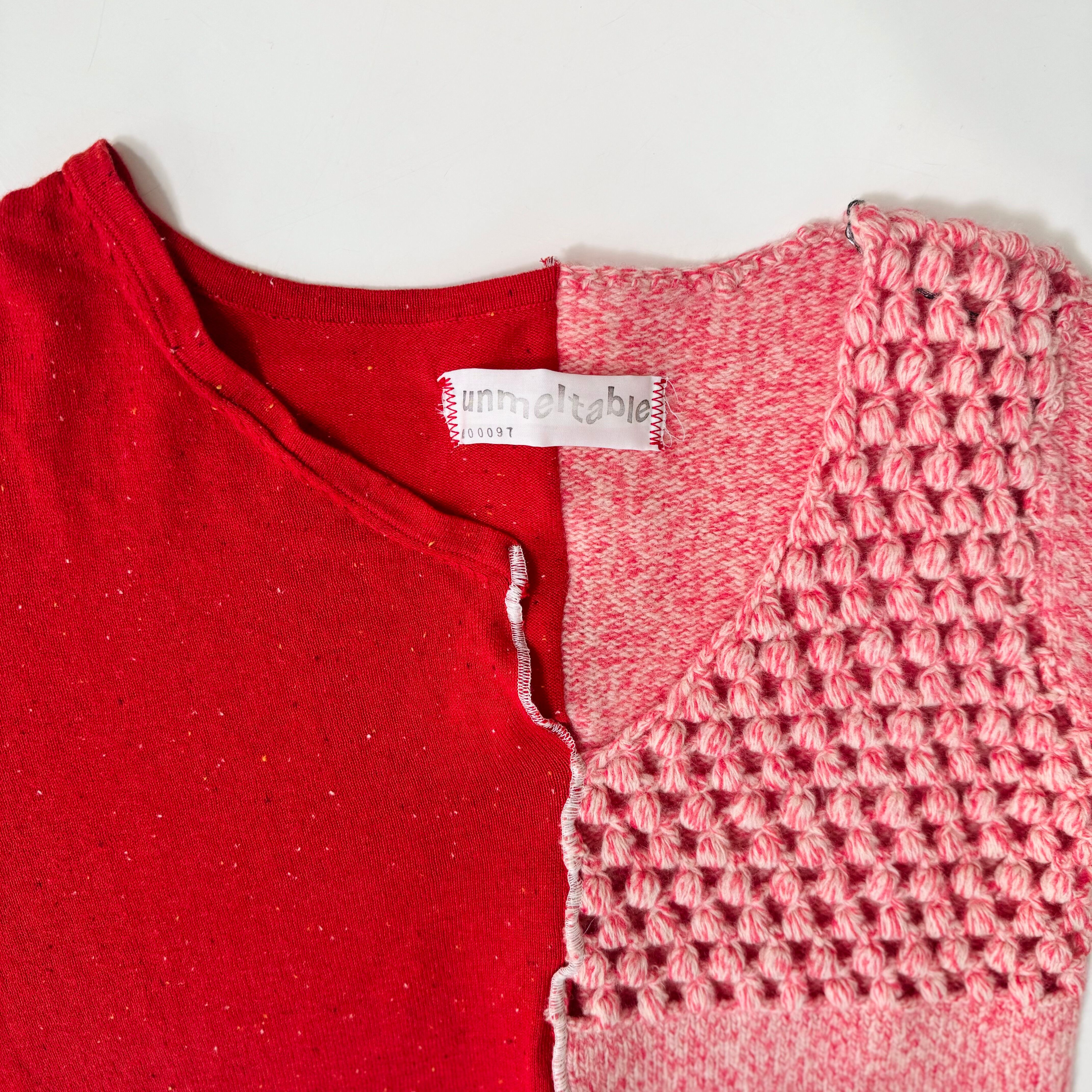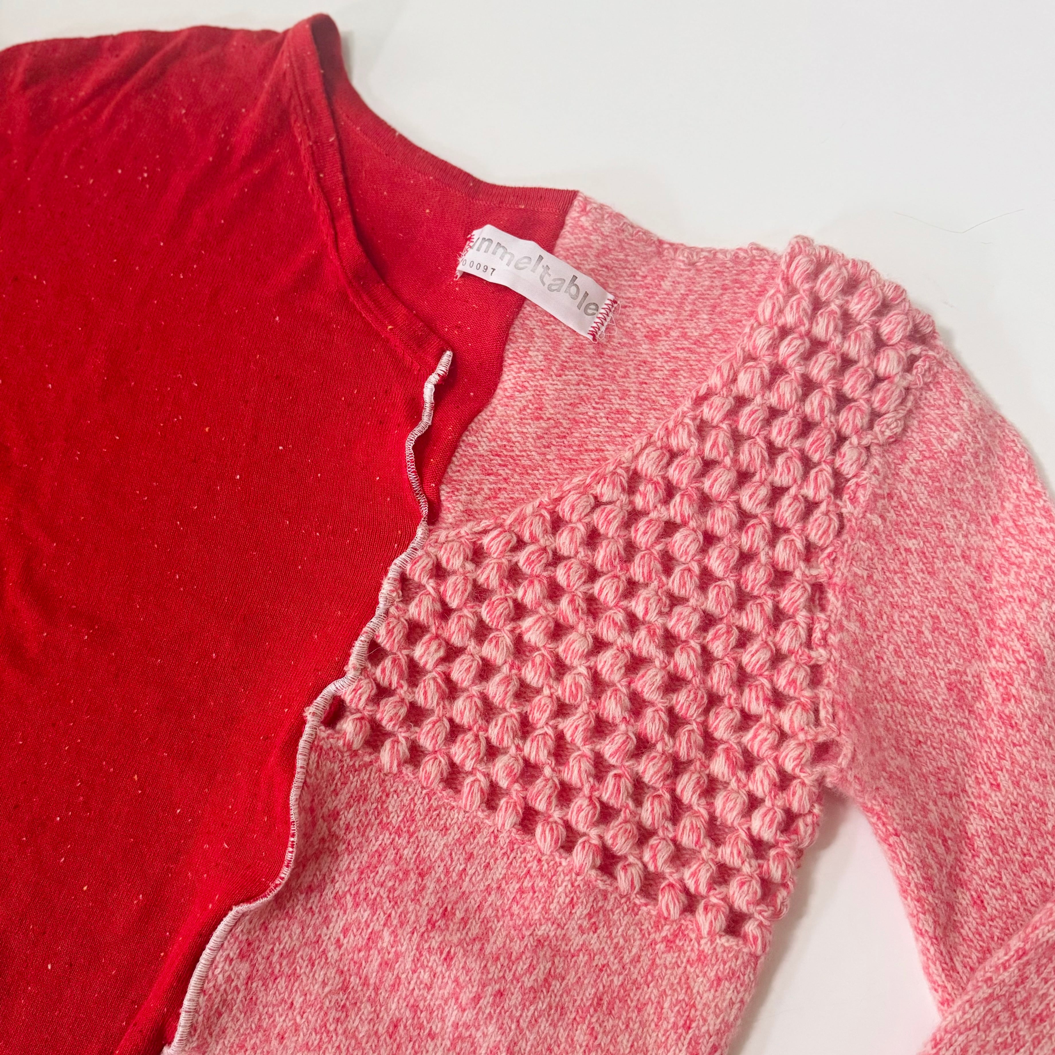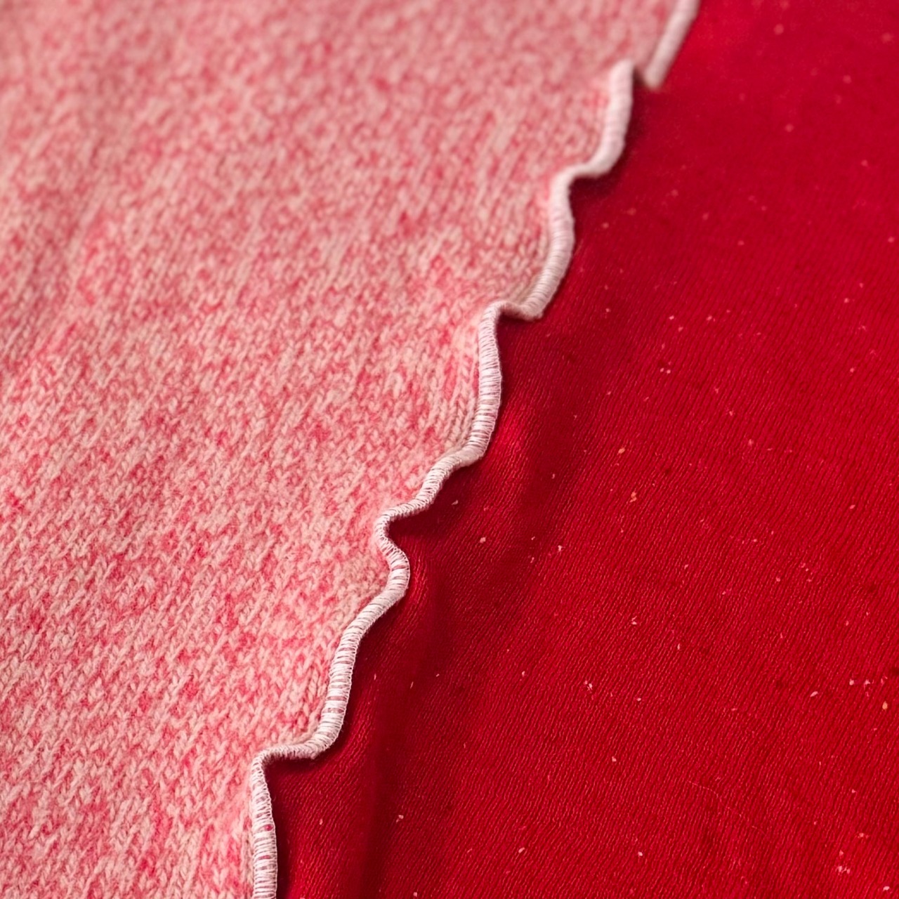 フリル付きの赤は綿100%、模様編み入りの赤白ミックス・ヴィンテージニットはウール100%なので、若干、左半身が暑く感じるニットです笑