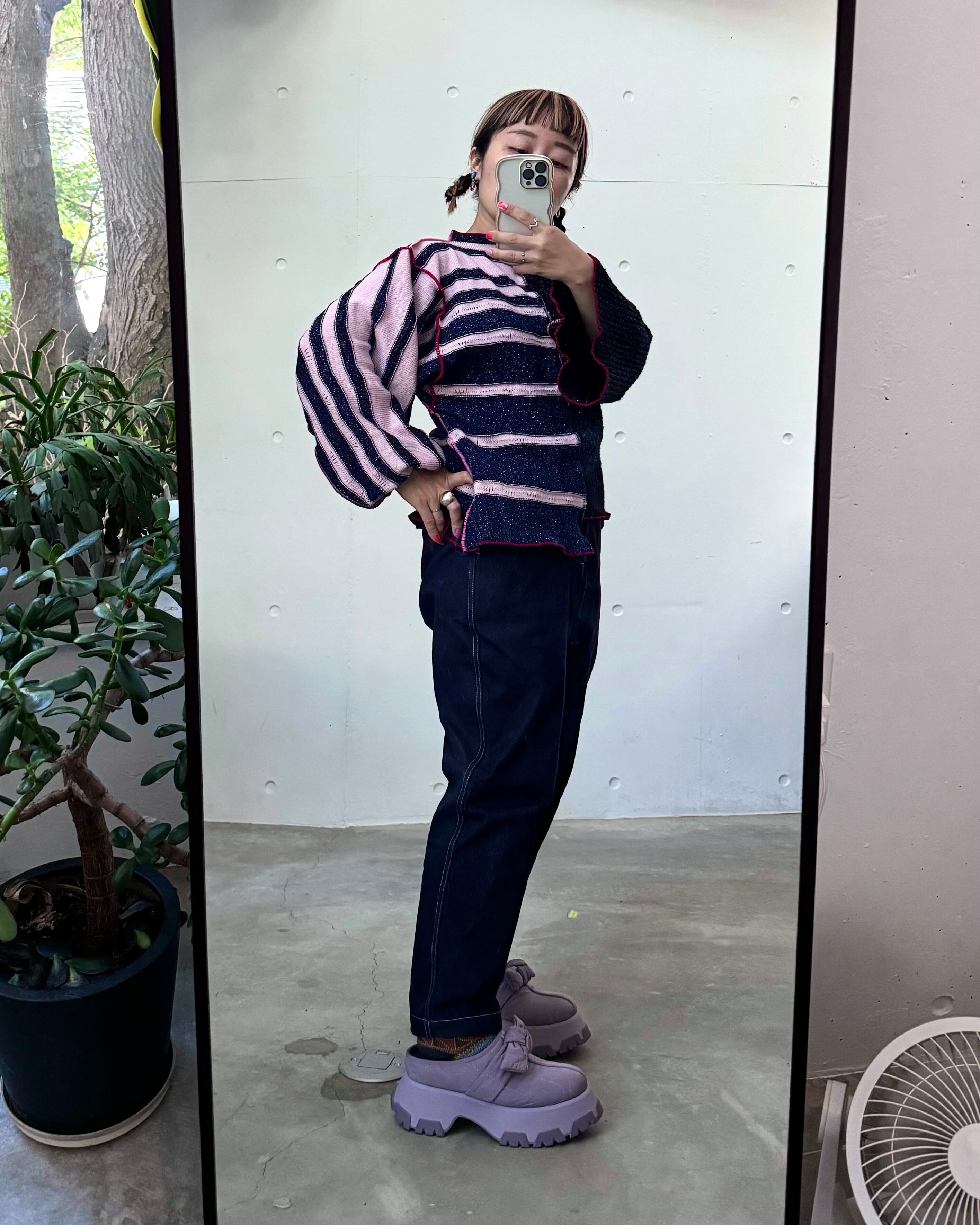 キモノスリーブに赤&ピンクのうねうねステッチ、