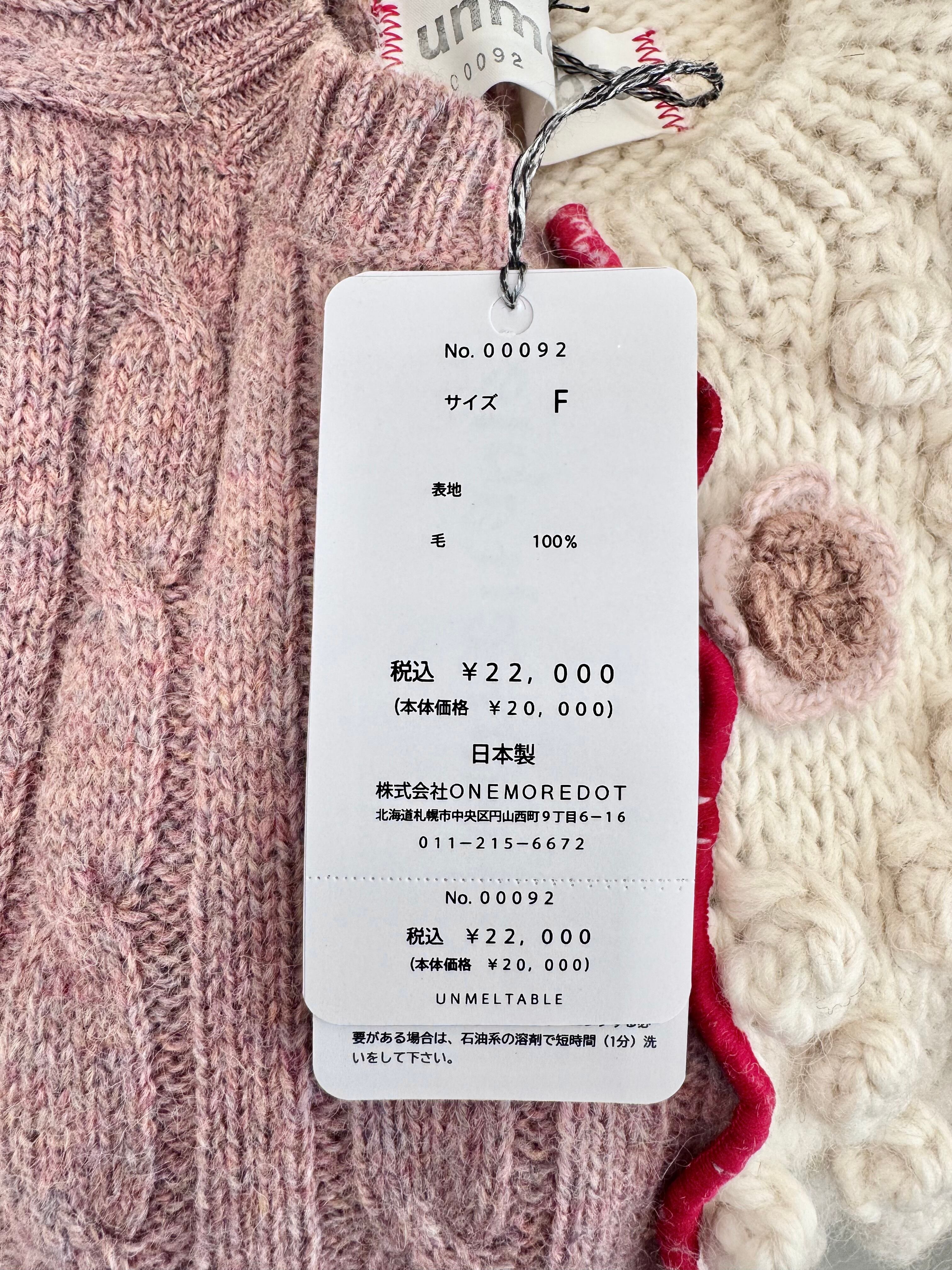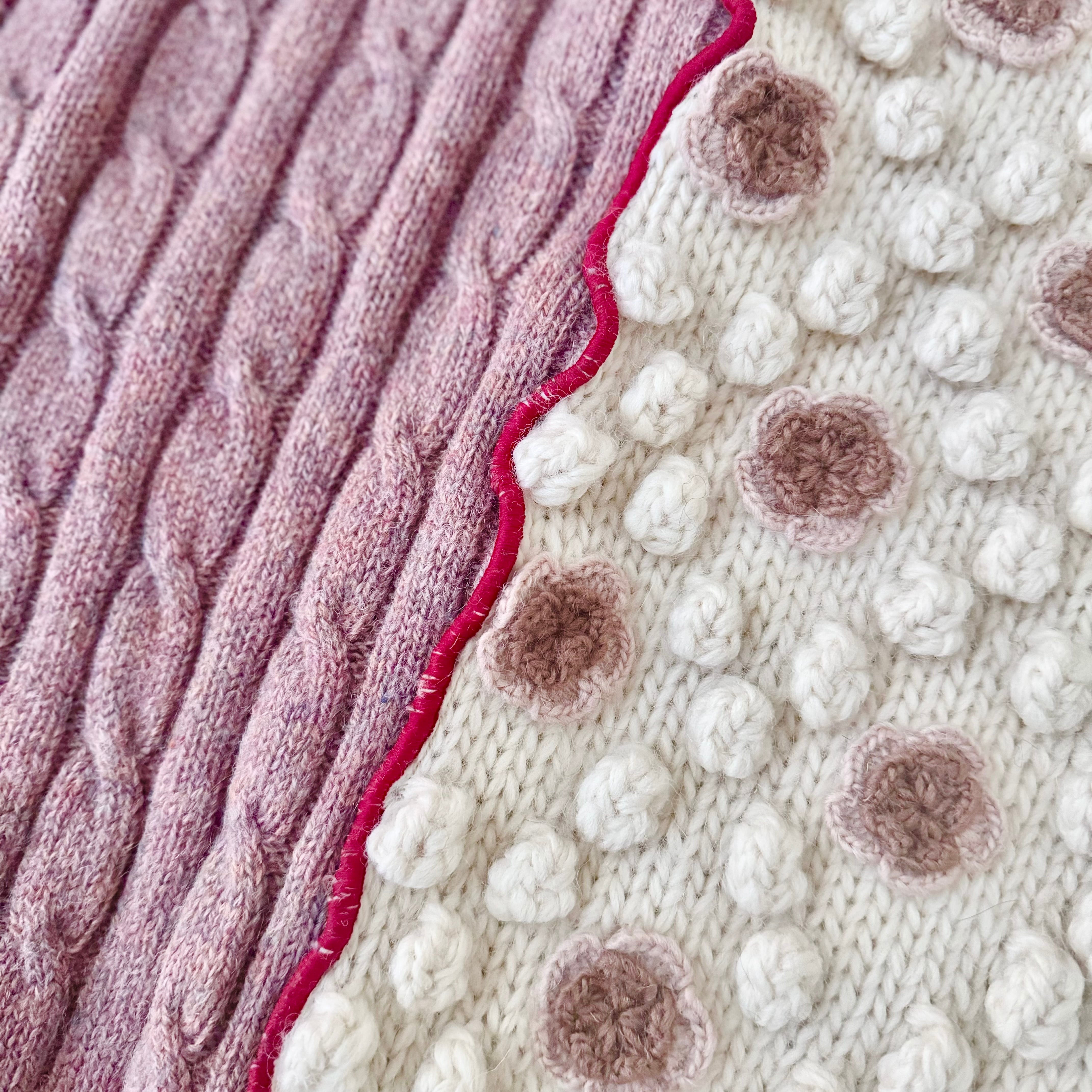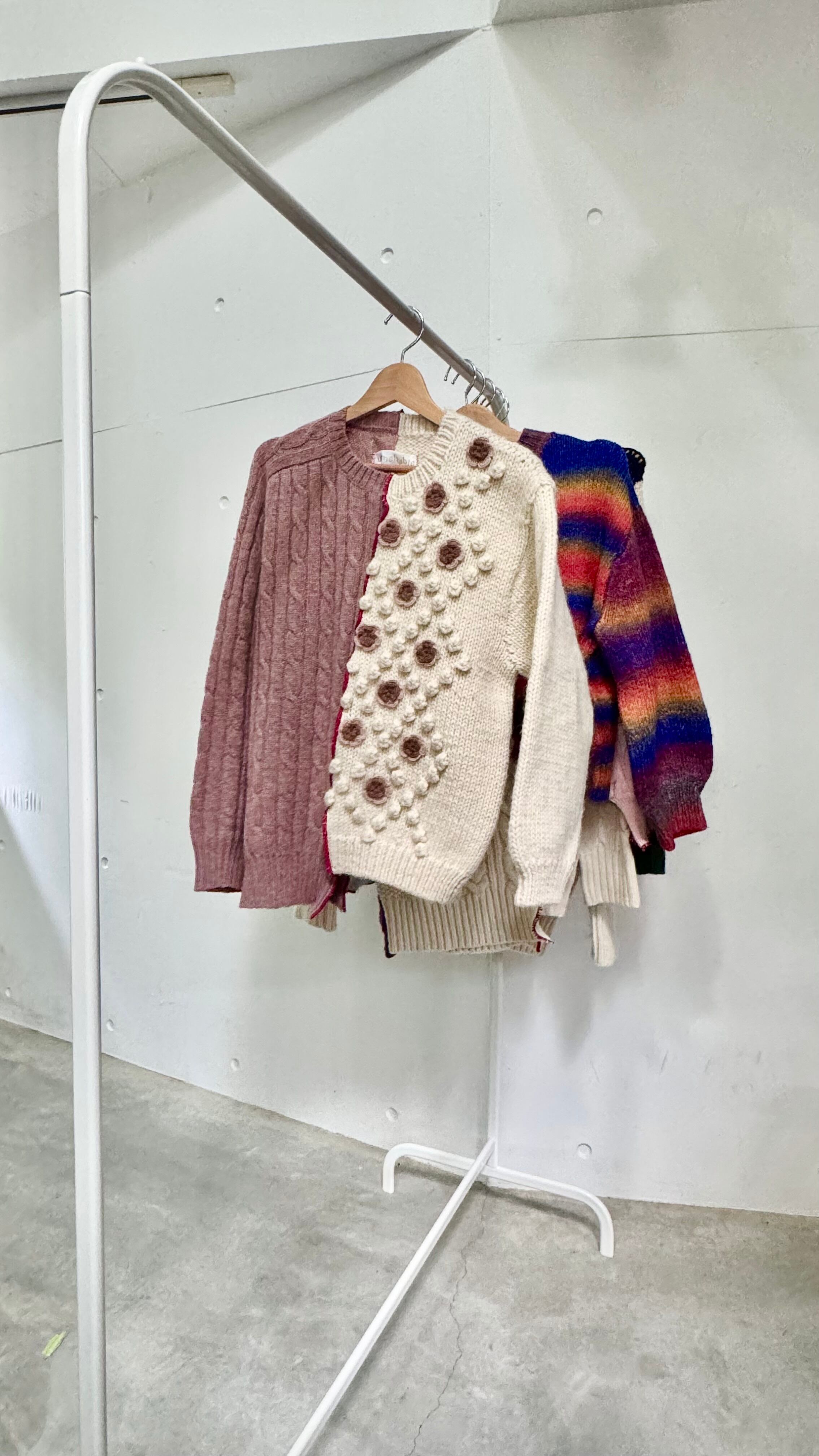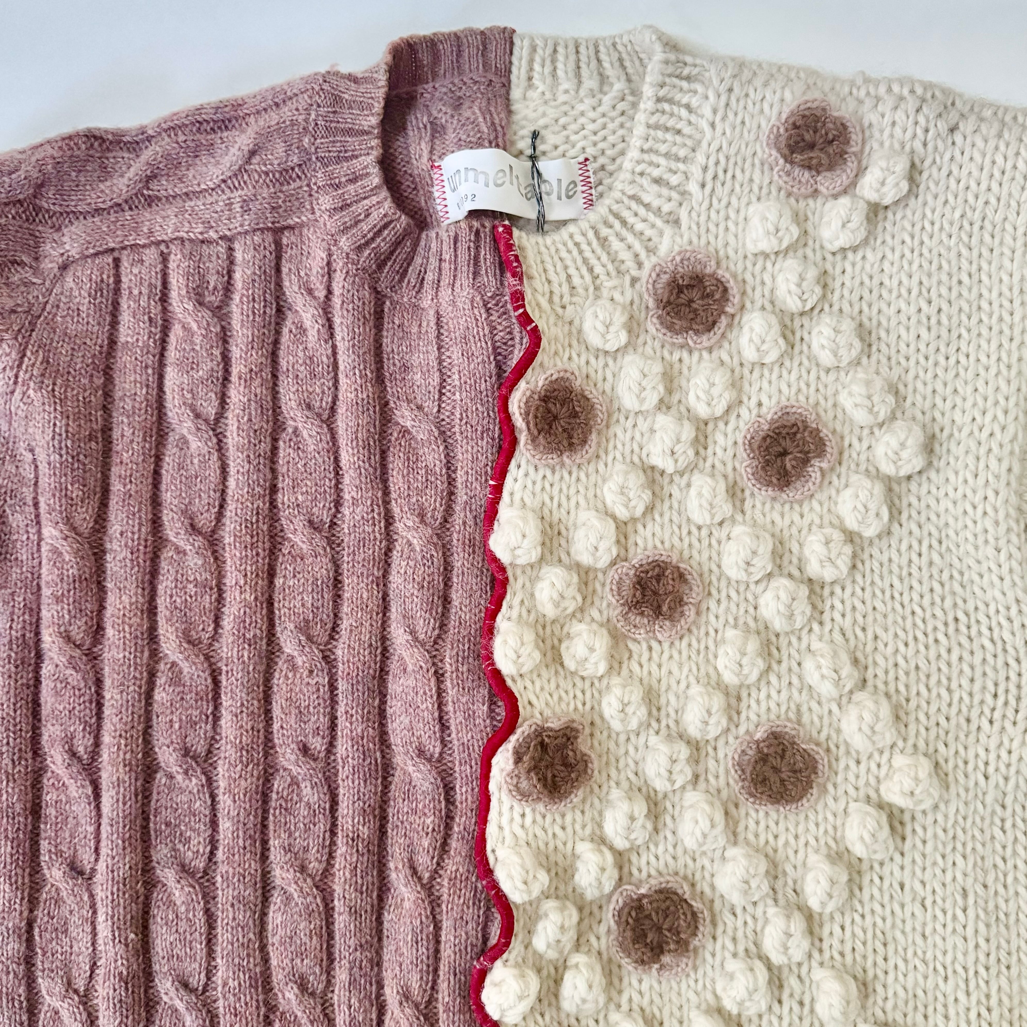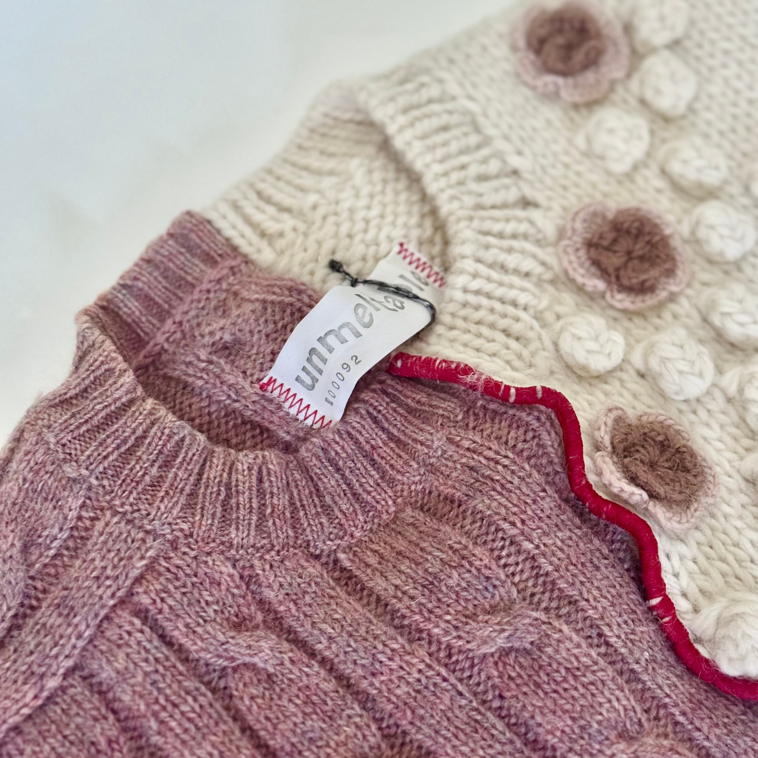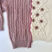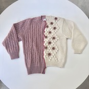 アイボリーの手編みでポコポコやお花がついたニットと、くすみピンクのアランニット。