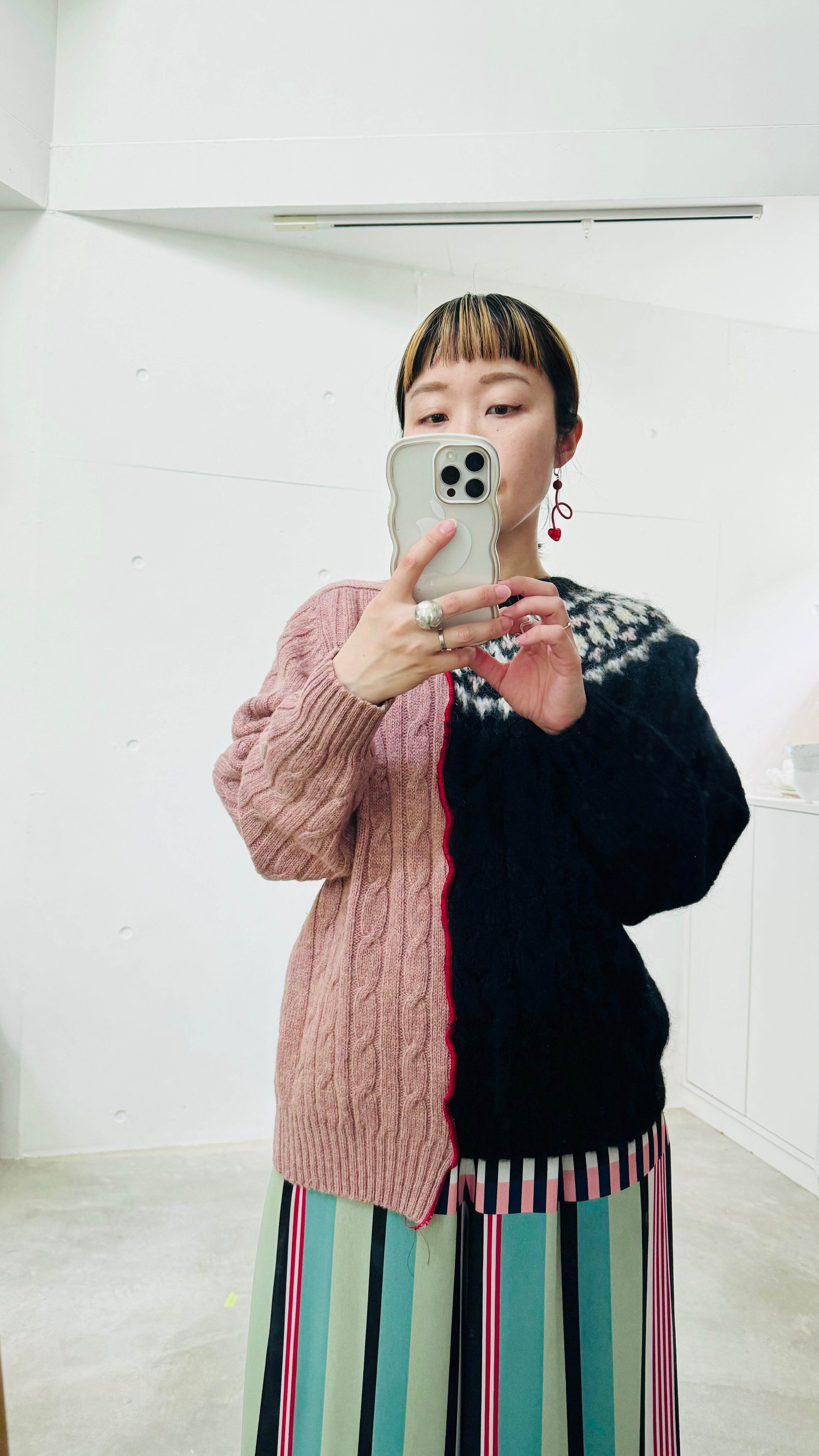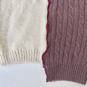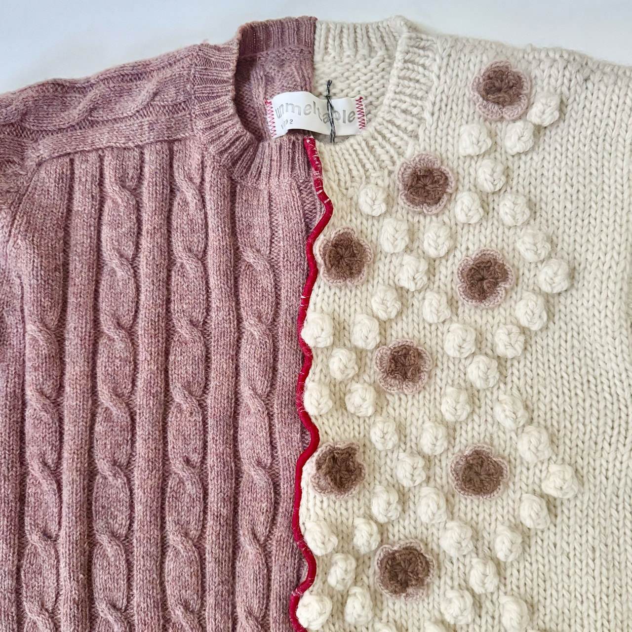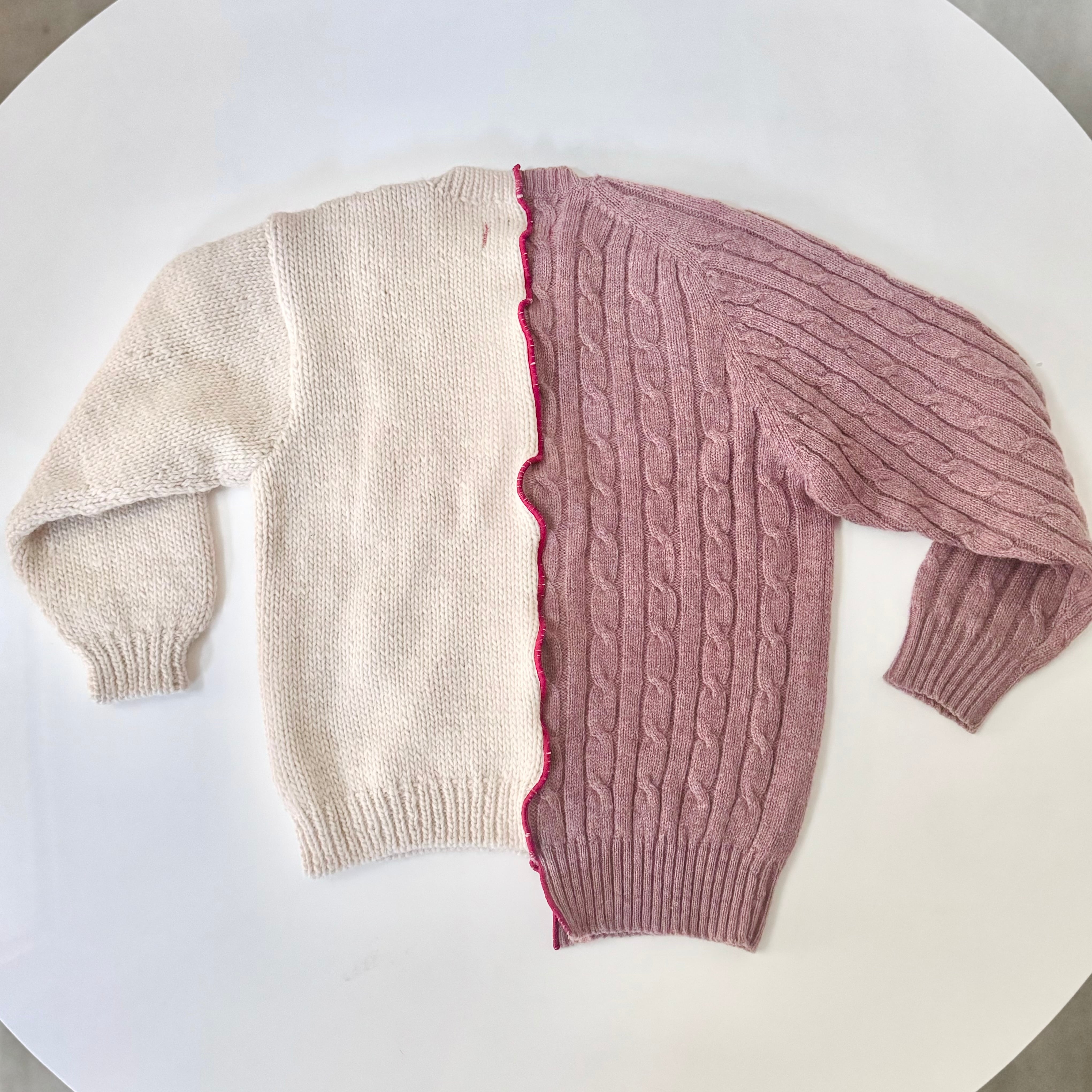 右も左もウール100%、厚手アイボリーニットと薄手くすみピンクニットをRED LINEで力強く繋ぎました。